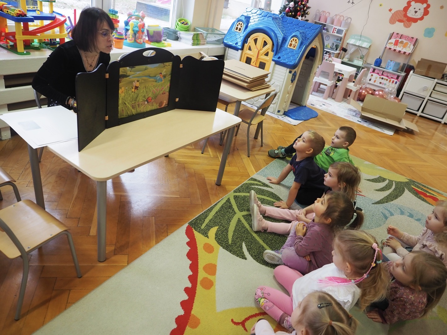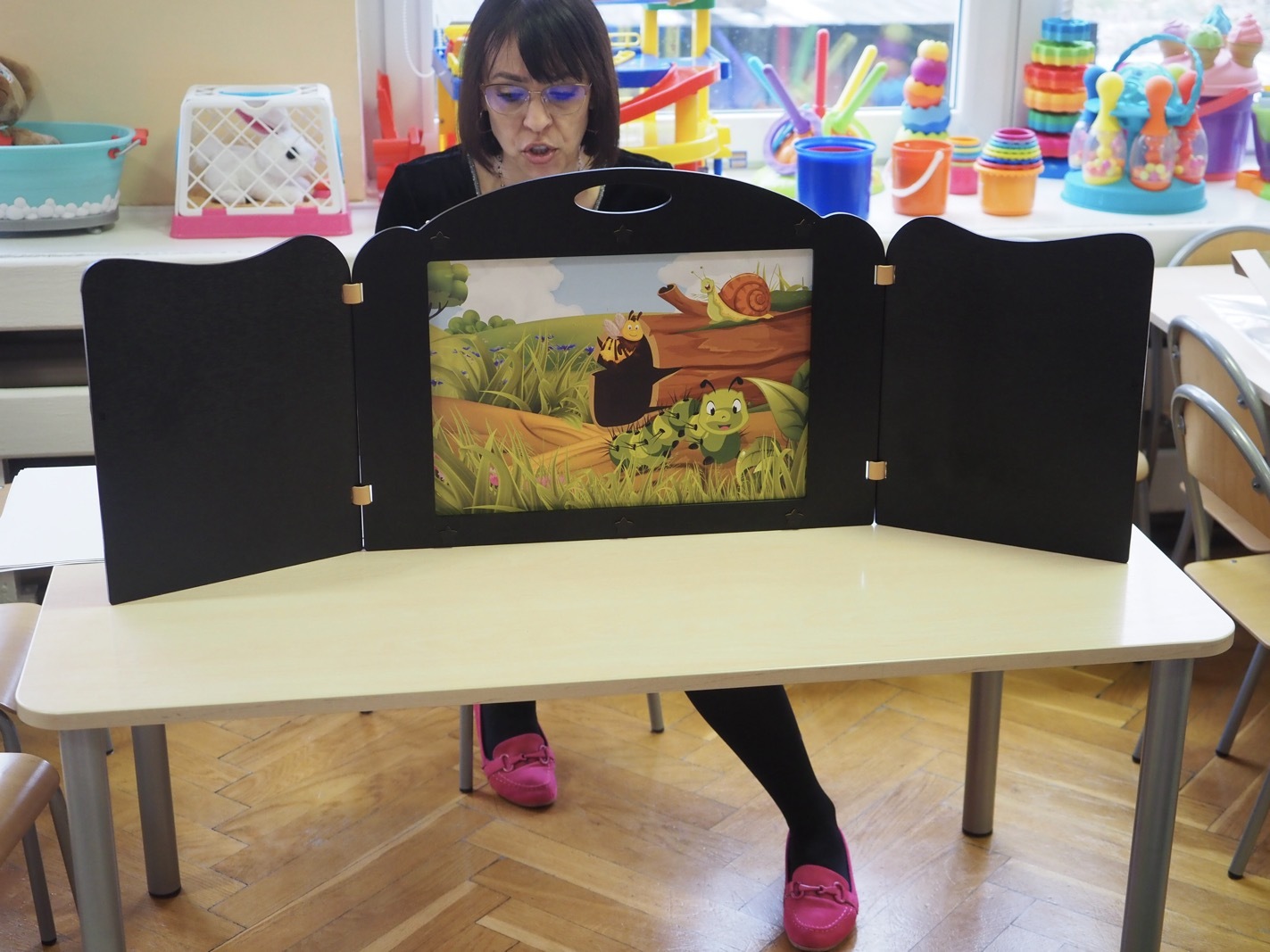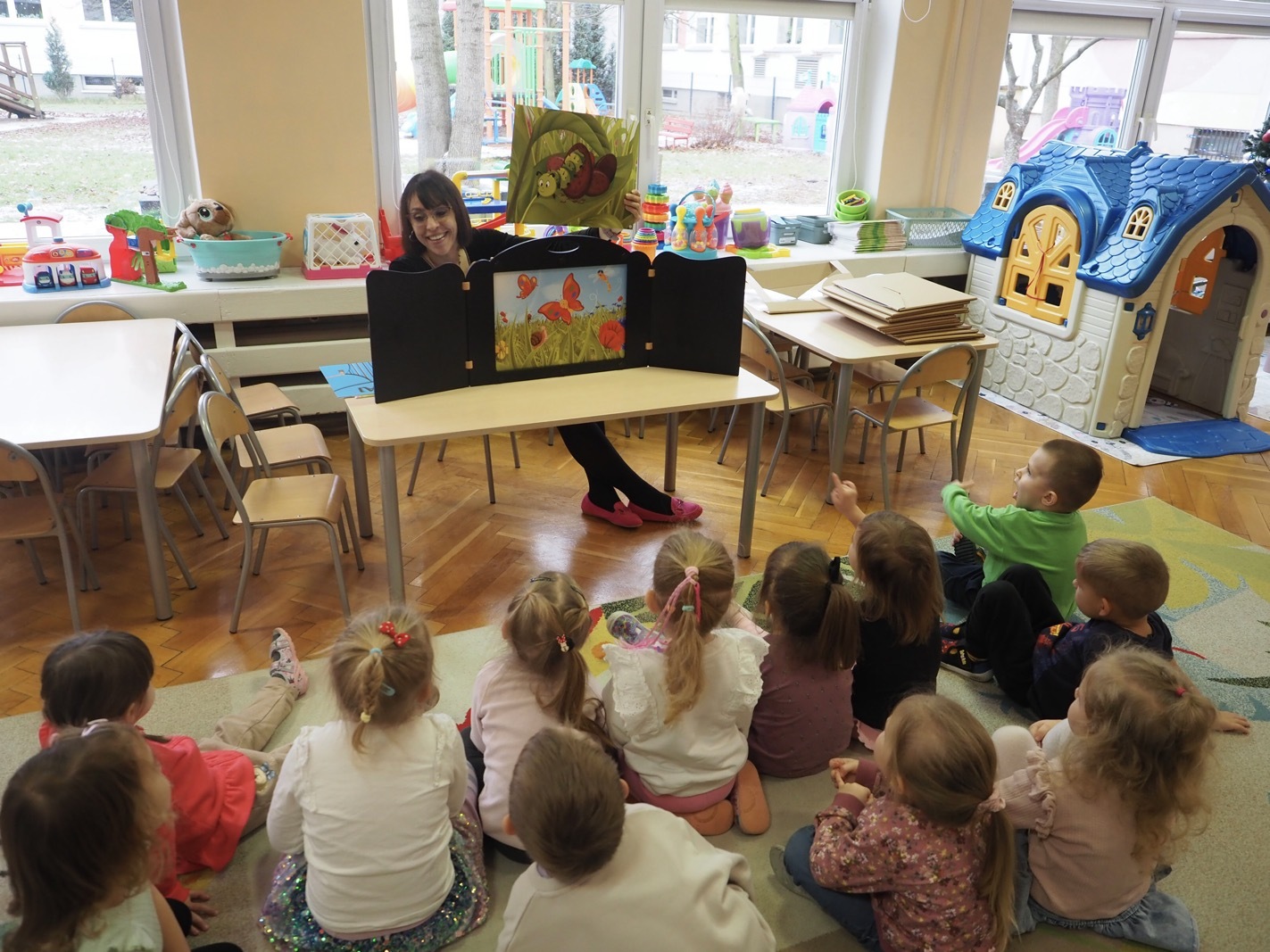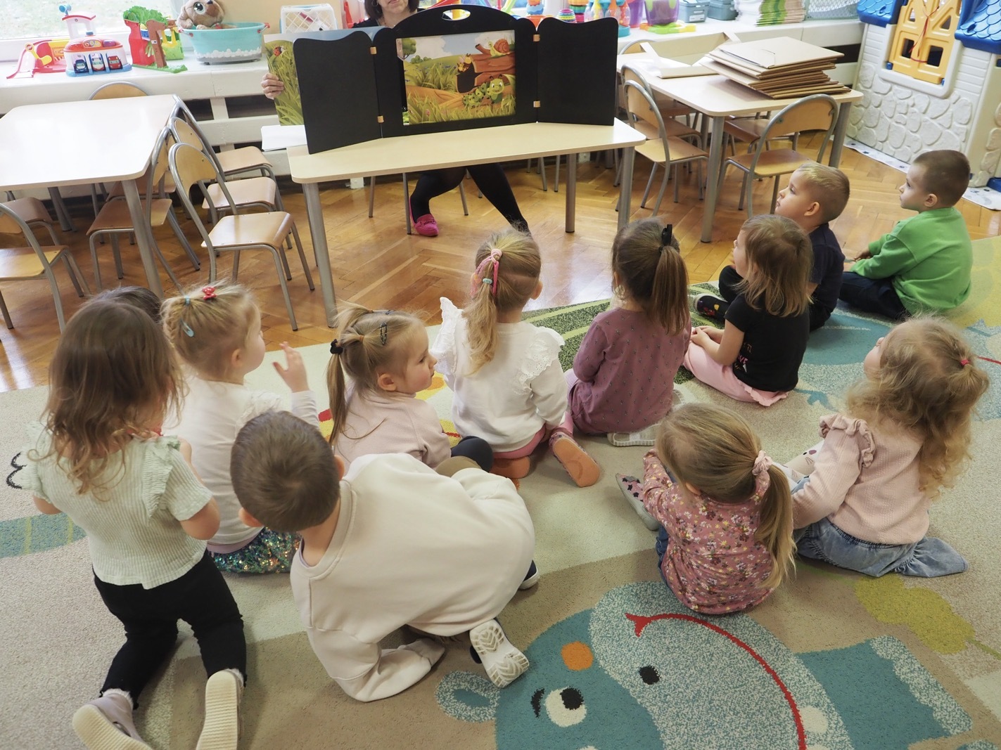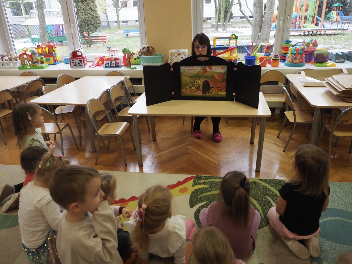 Kamishibai - teatrzyk obrazkowy ukryty w "drewnianej skrzynce". Dziś opowieść o Magicznej gąsienicy - grupa 1