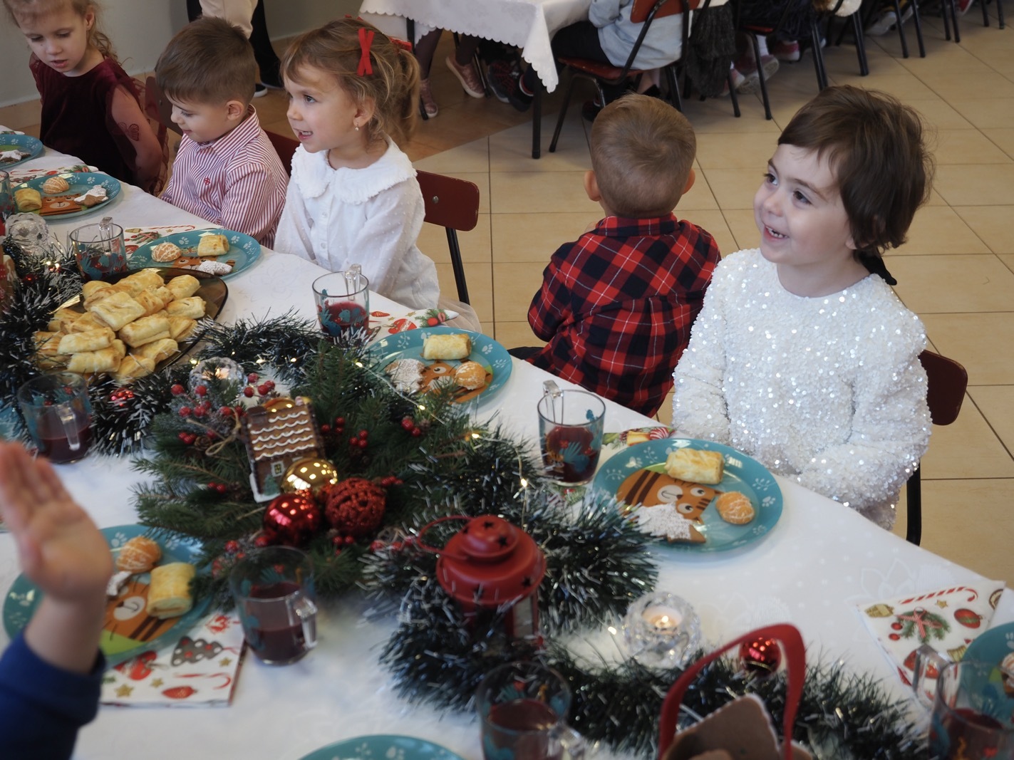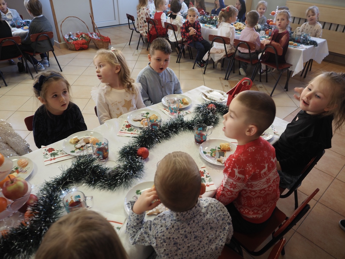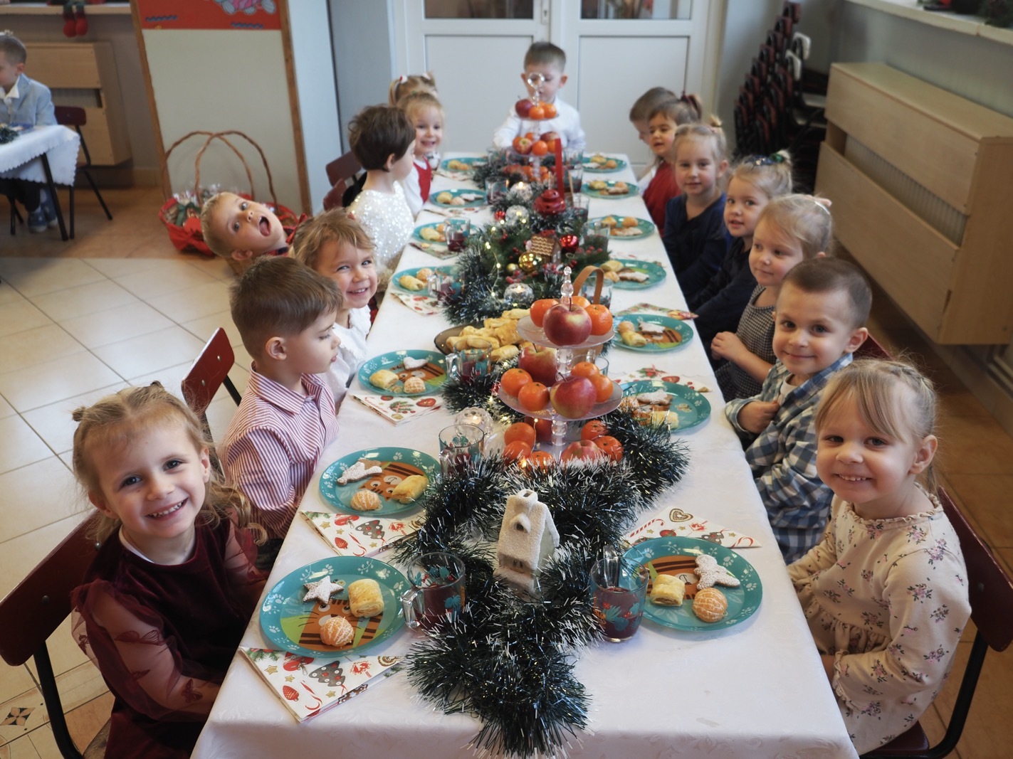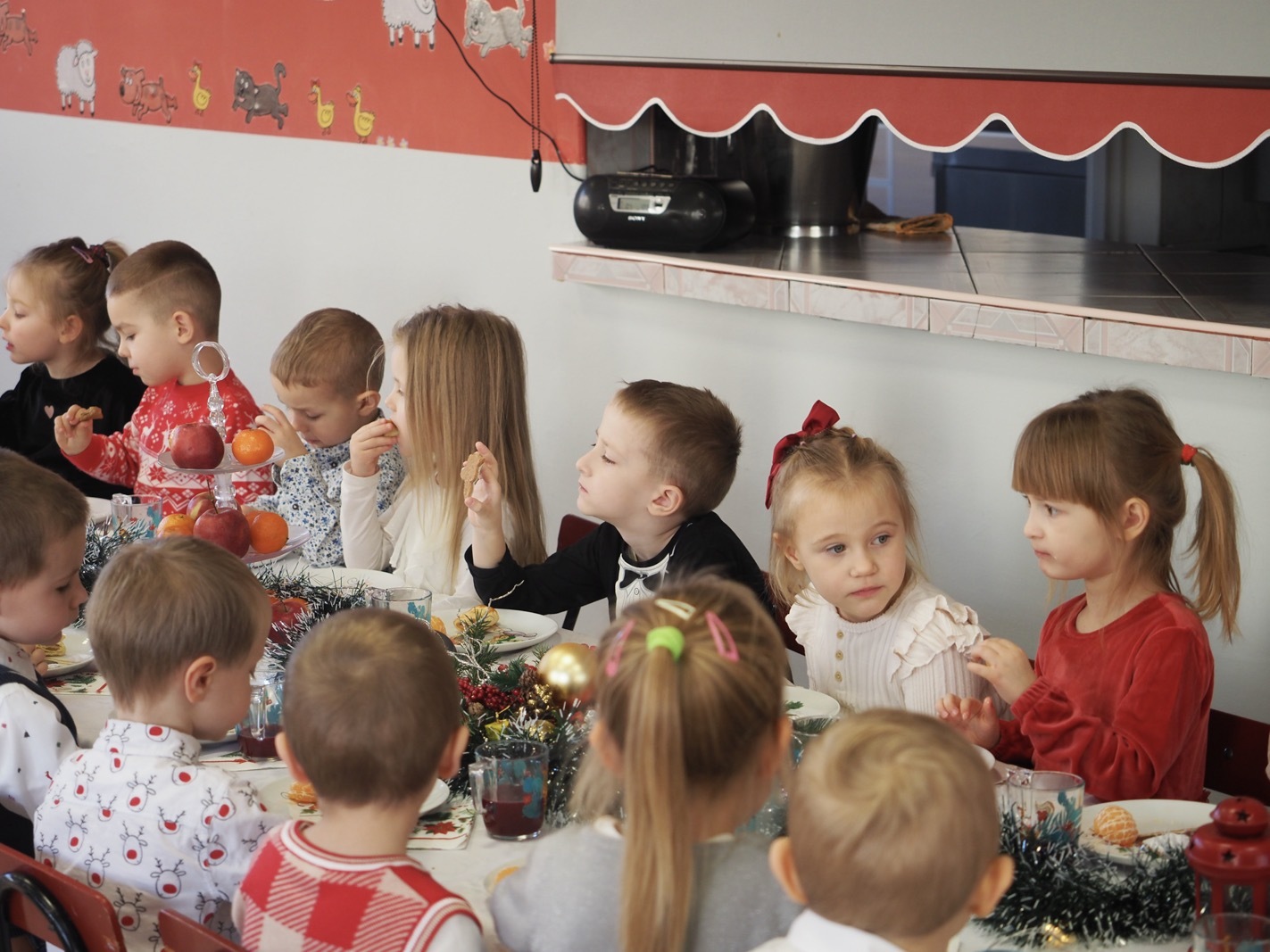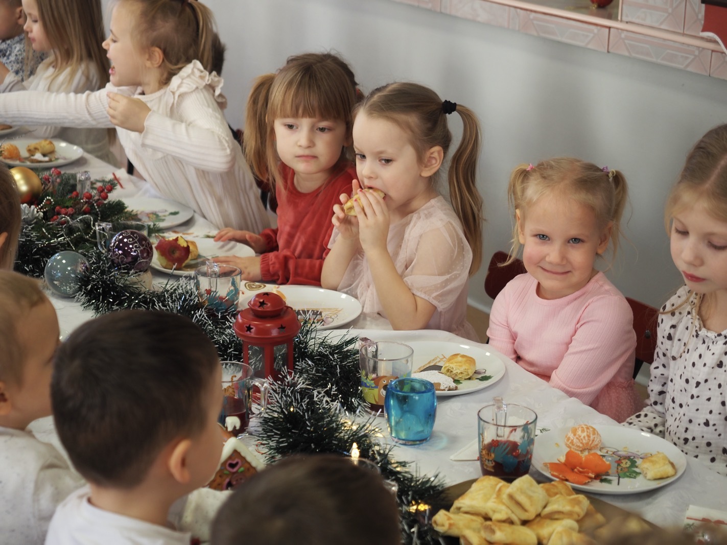 Po pięknych i wzruszających występach dzieci przyszedł czas na życzenia, dzielenie się opłatkiem i wspólne kolędowanie przy wigilijnym stole. Wspólne śpiewanie przy wigilijnym stole niesie radość oraz poczucie bliskości i jedności. Ten dzień długo zostanie w pamięci dzieci i całego personelu. Było cudownie, radośnie i rodzinnie, po prostu magia świąt