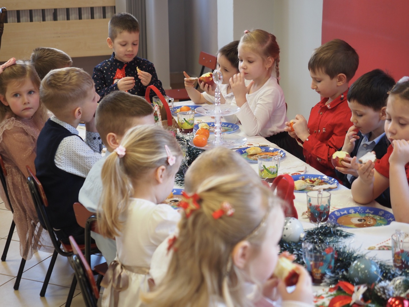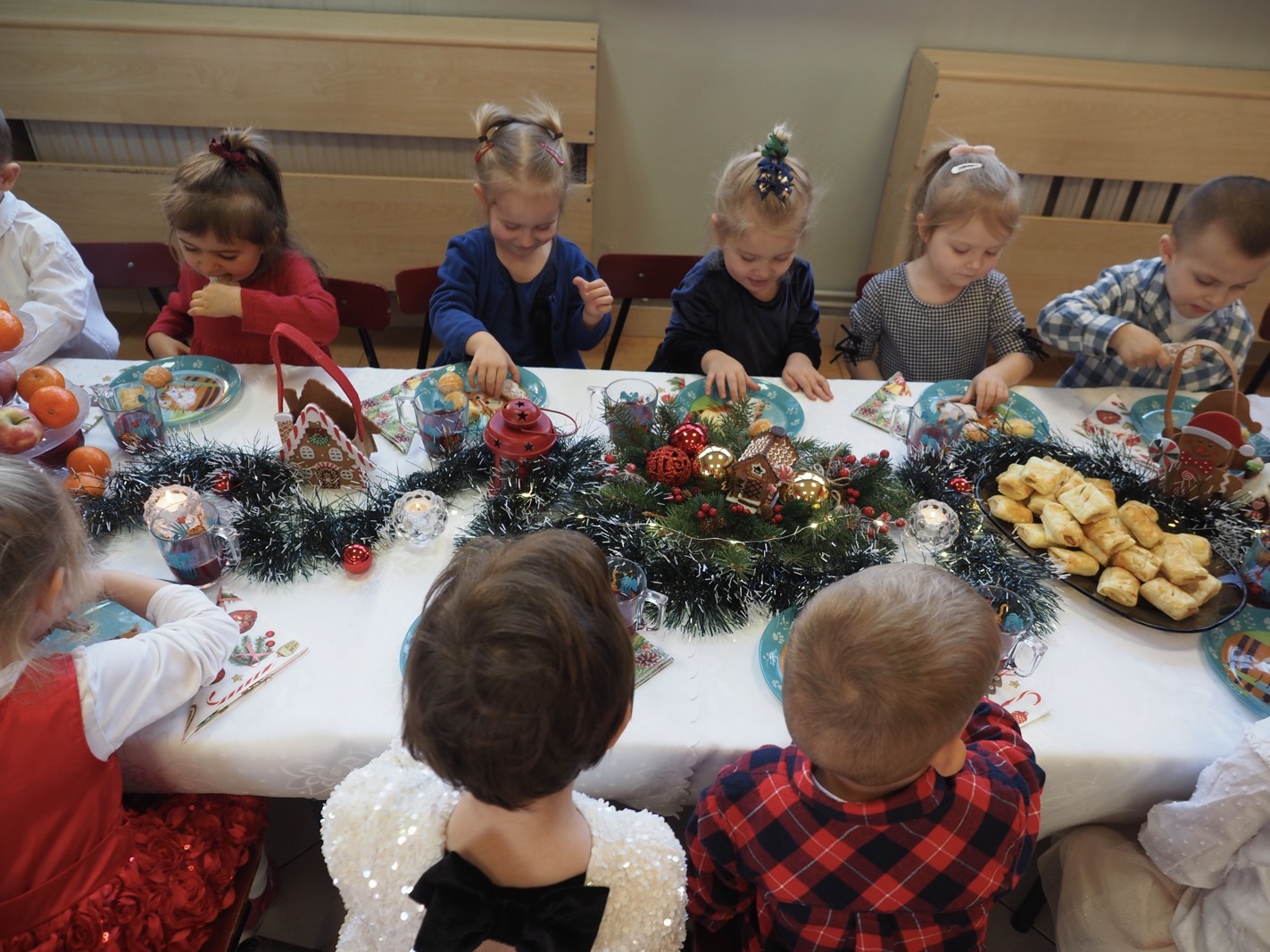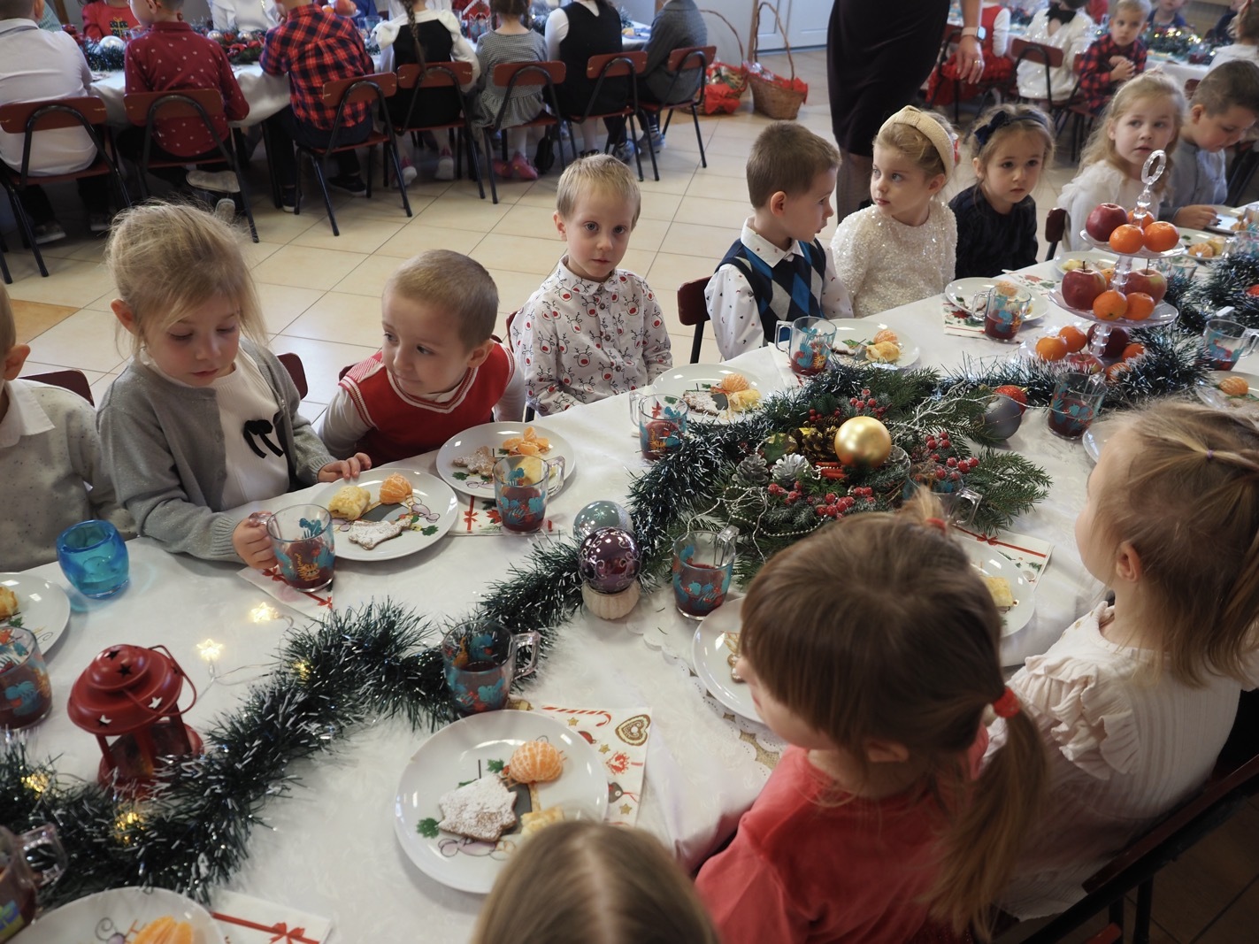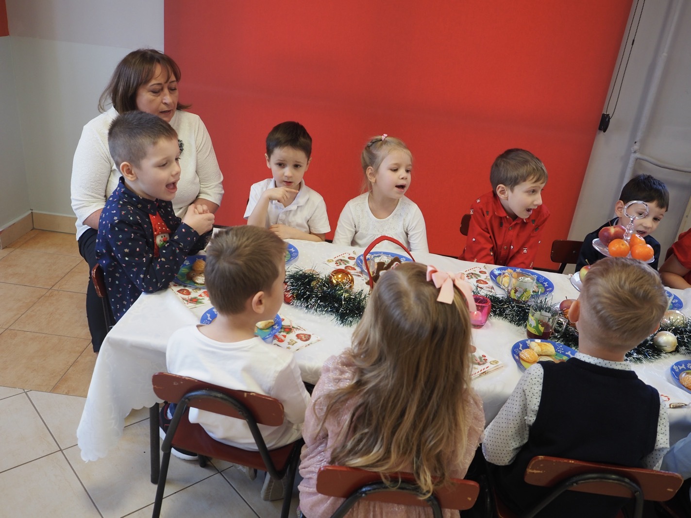 Po pięknych i wzruszających występach dzieci przyszedł czas na życzenia, dzielenie się opłatkiem i wspólne kolędowanie przy wigilijnym stole. Wspólne śpiewanie przy wigilijnym stole niesie radość oraz poczucie bliskości i jedności. Ten dzień długo zostanie w pamięci dzieci i całego personelu. Było cudownie, radośnie i rodzinnie, po prostu magia świąt