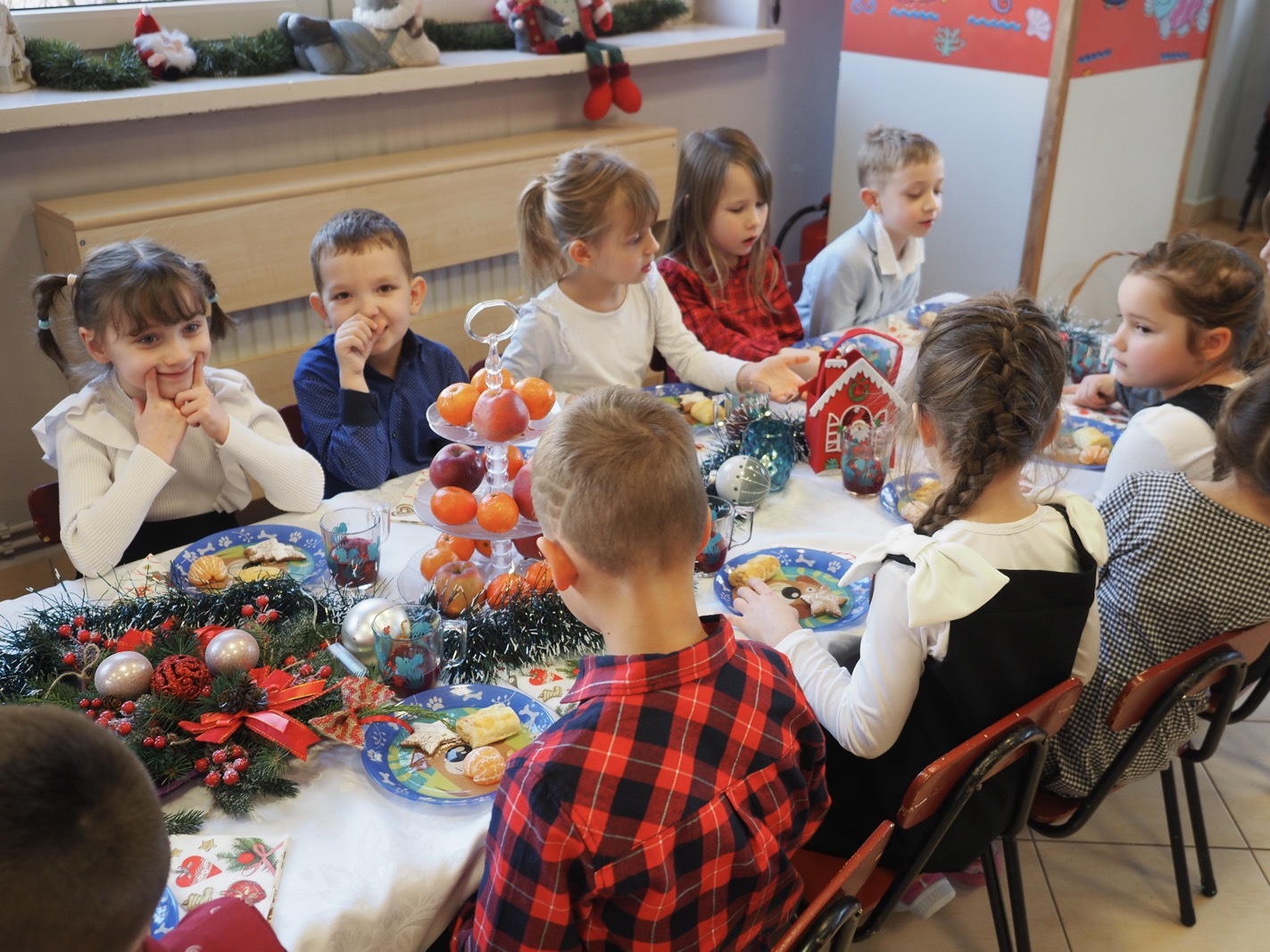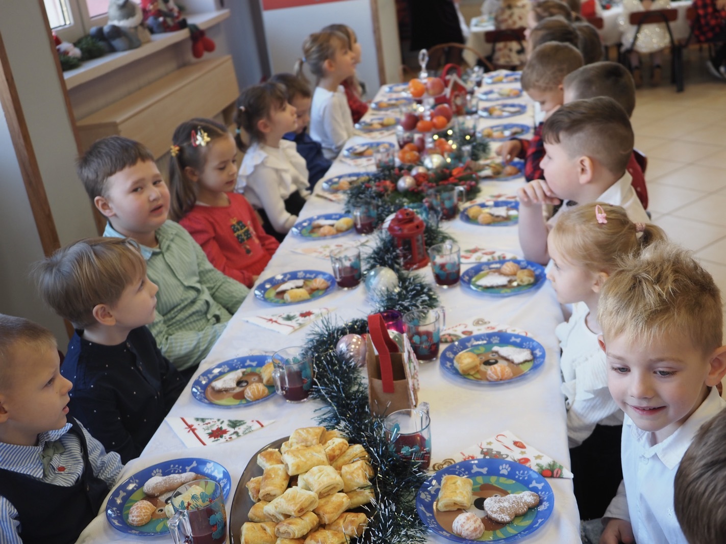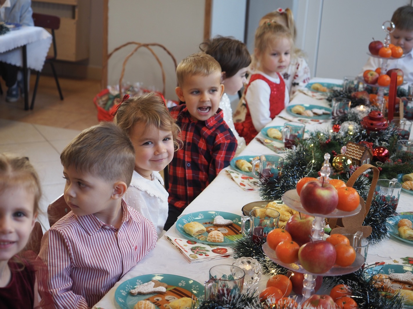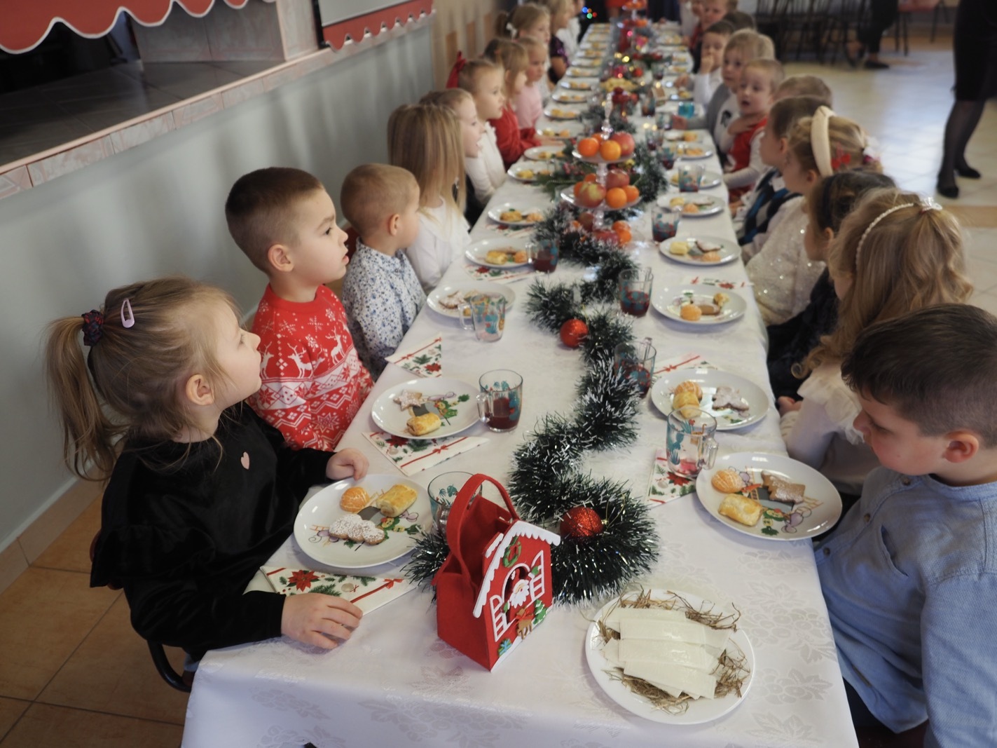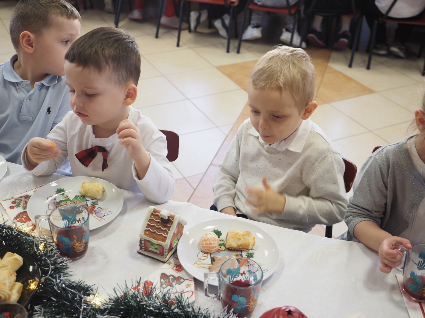 Po pięknych i wzruszających występach dzieci przyszedł czas na życzenia, dzielenie się opłatkiem i wspólne kolędowanie przy wigilijnym stole. Wspólne śpiewanie przy wigilijnym stole niesie radość oraz poczucie bliskości i jedności. Ten dzień długo zostanie w pamięci dzieci i całego personelu. Było cudownie, radośnie i rodzinnie, po prostu magia świąt
