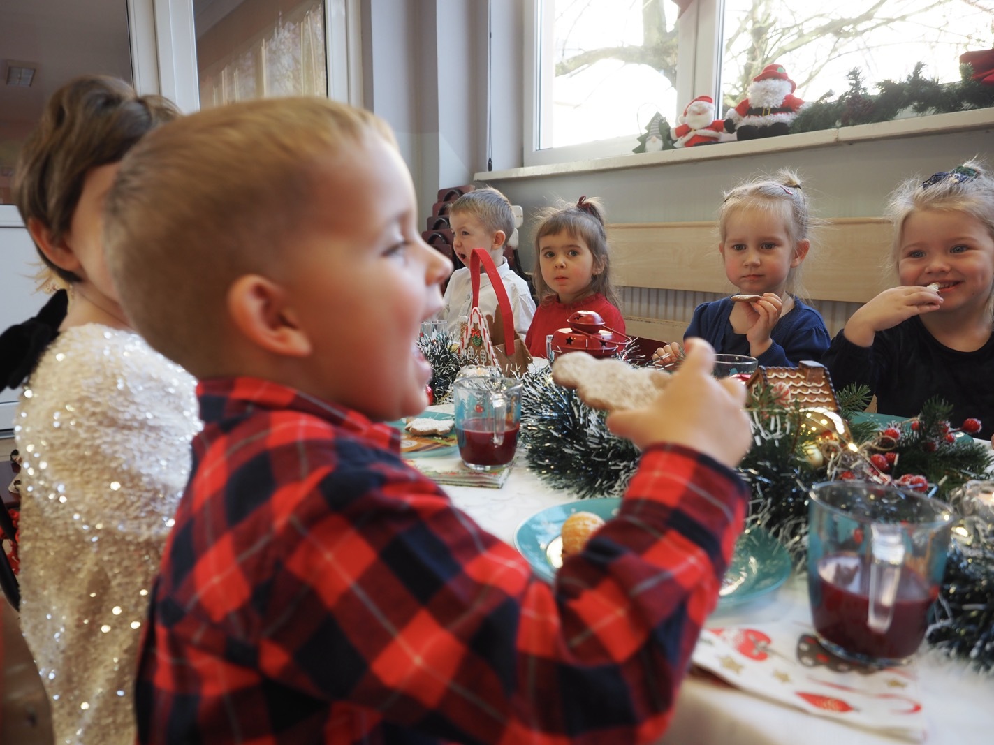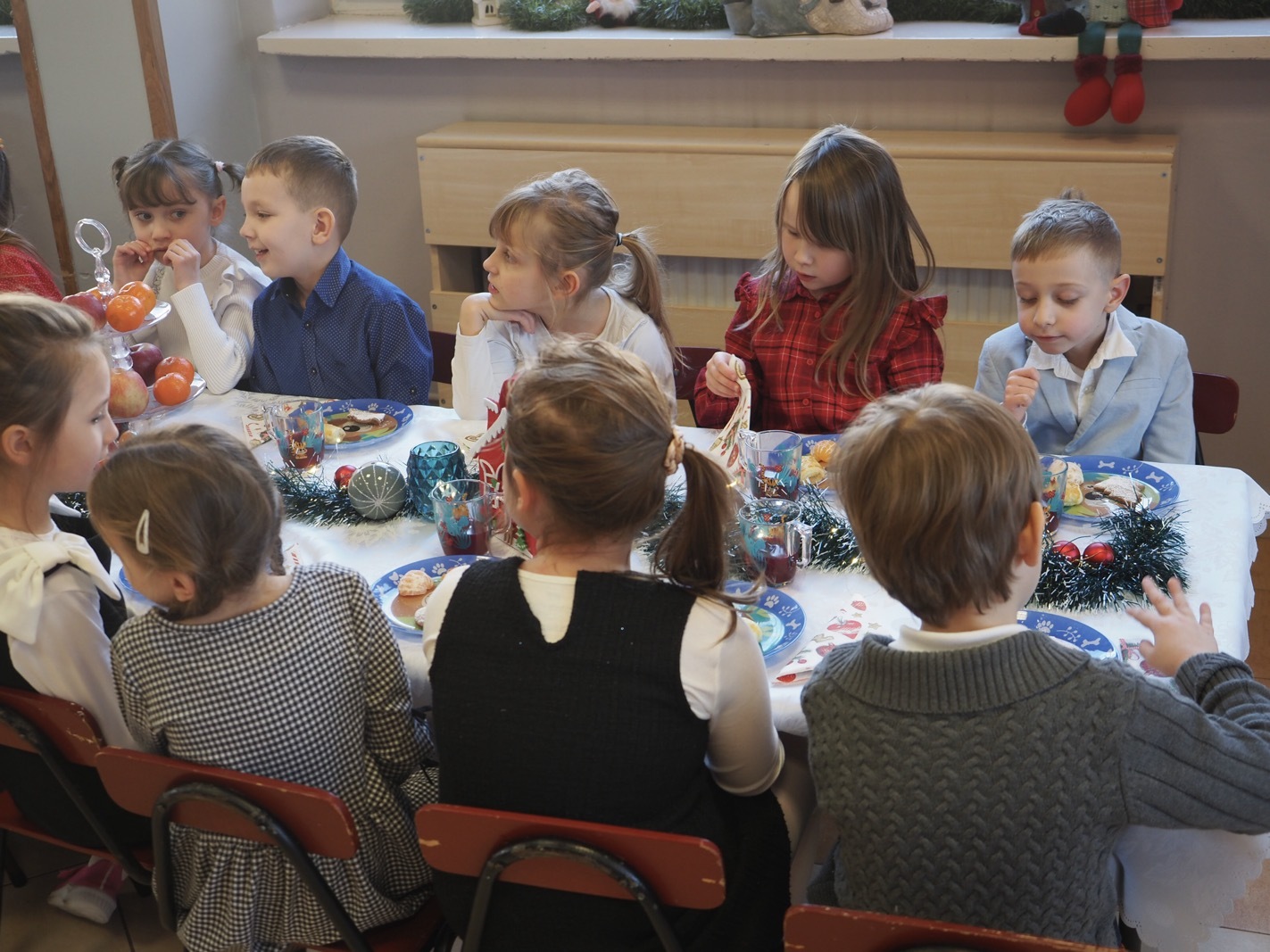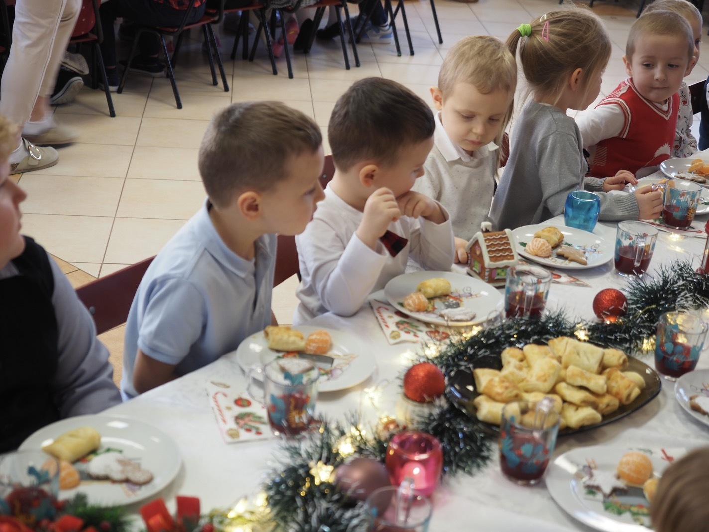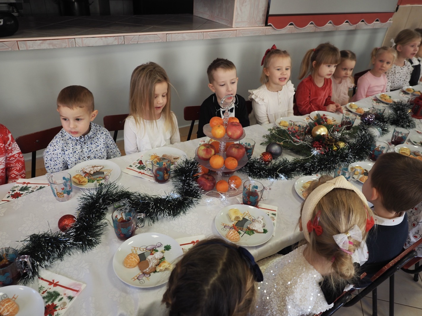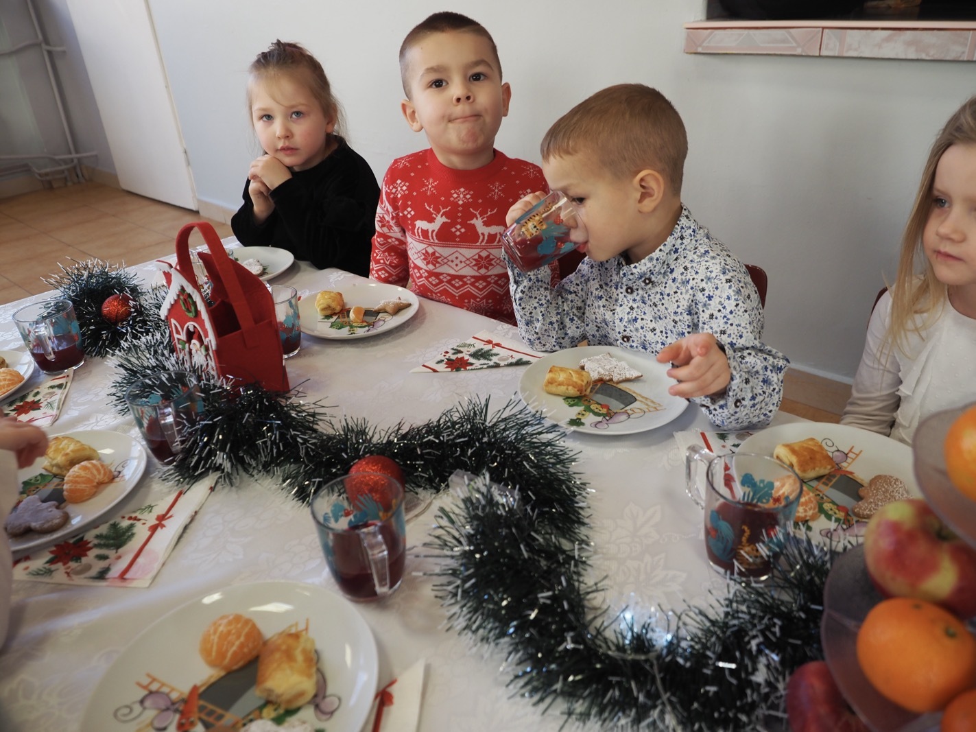Po pięknych i wzruszających występach dzieci przyszedł czas na życzenia, dzielenie się opłatkiem i wspólne kolędowanie przy wigilijnym stole. Wspólne śpiewanie przy wigilijnym stole niesie radość oraz poczucie bliskości i jedności. Ten dzień długo zostanie w pamięci dzieci i całego personelu. Było cudownie, radośnie i rodzinnie, po prostu magia świąt