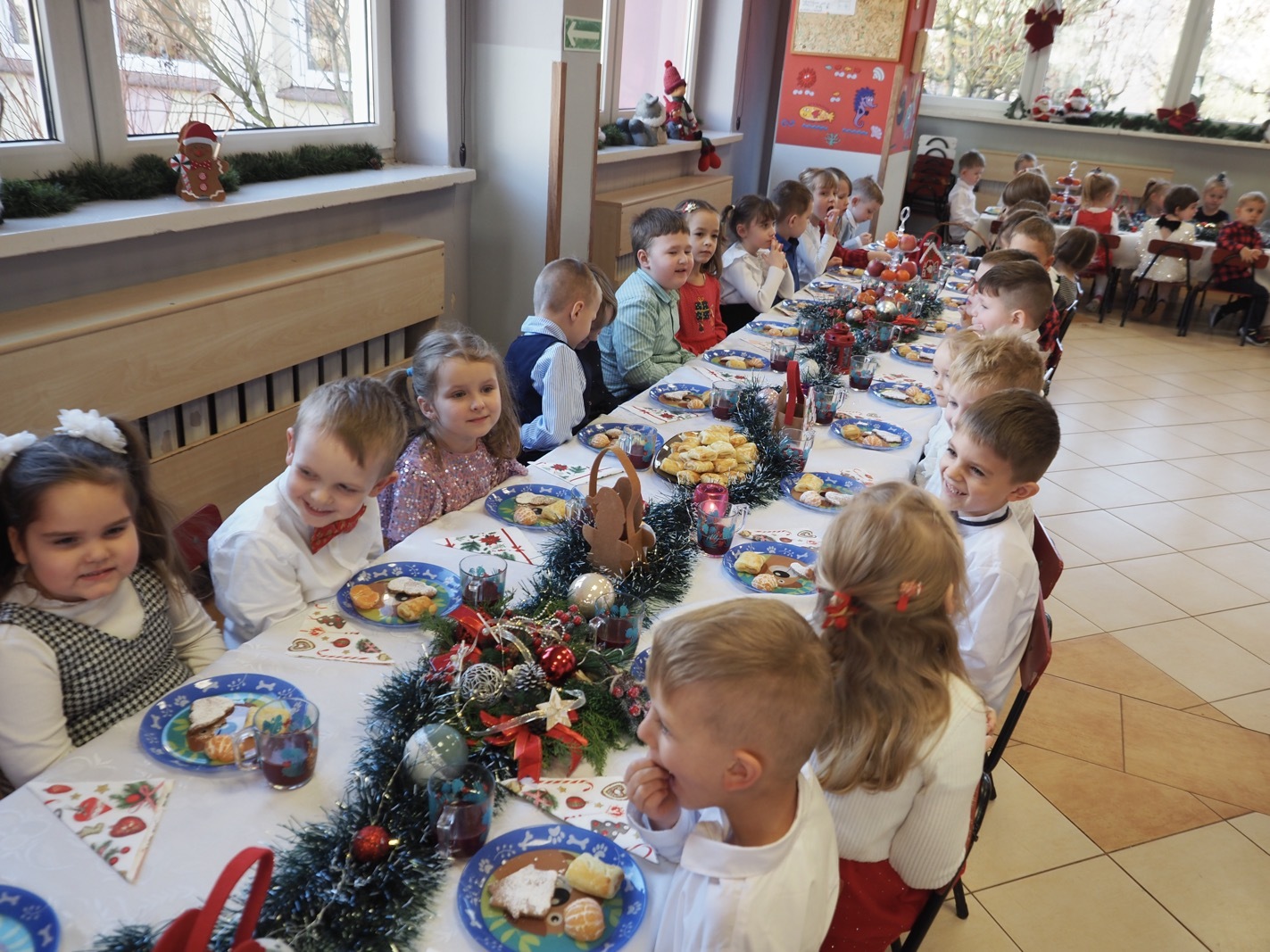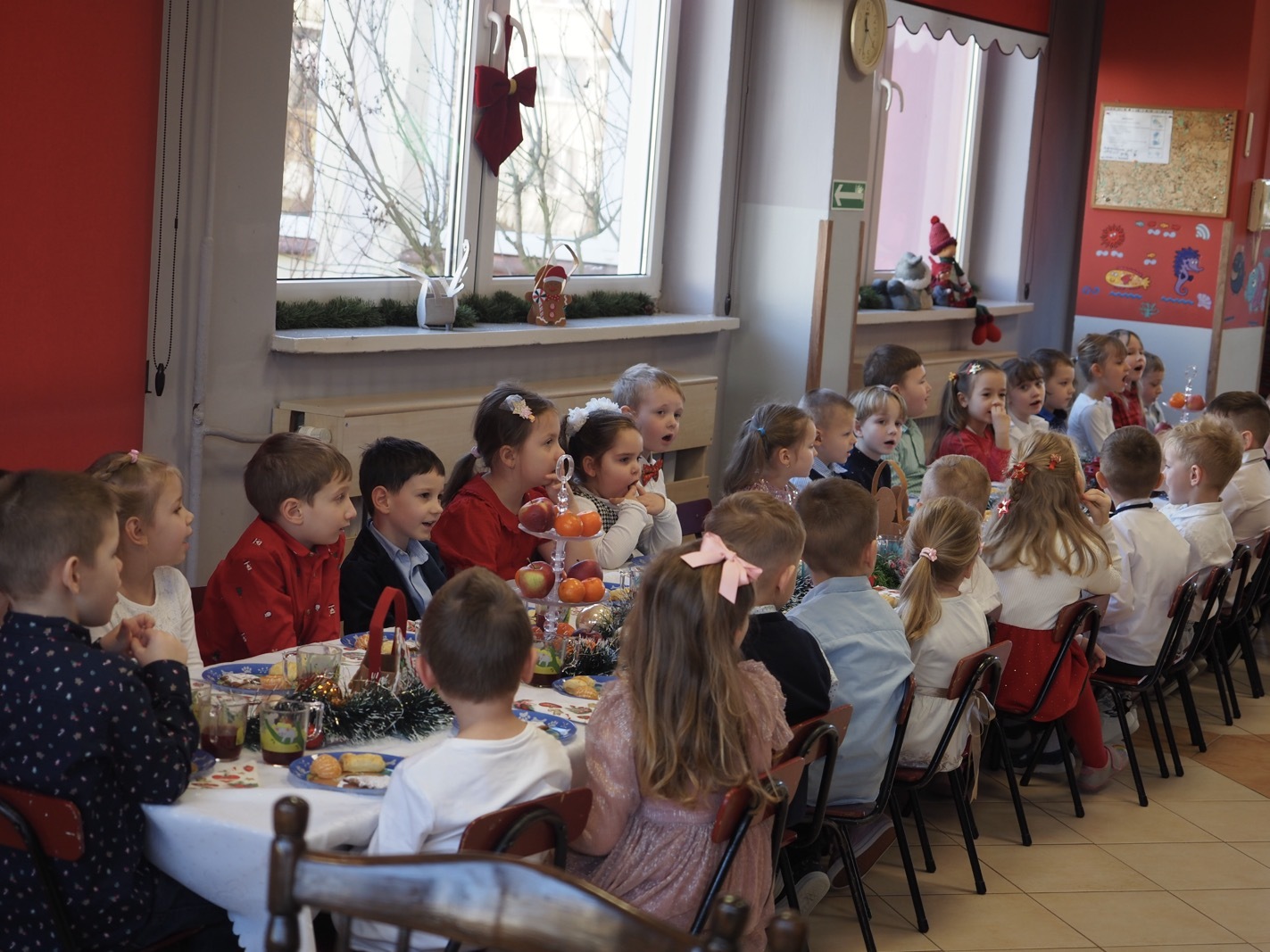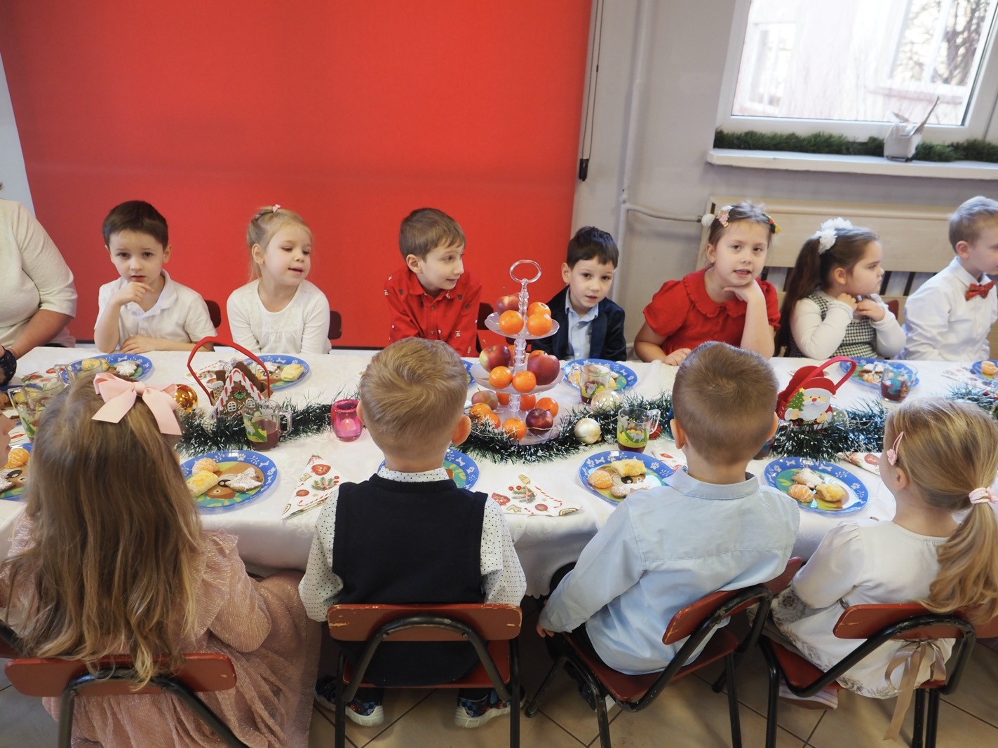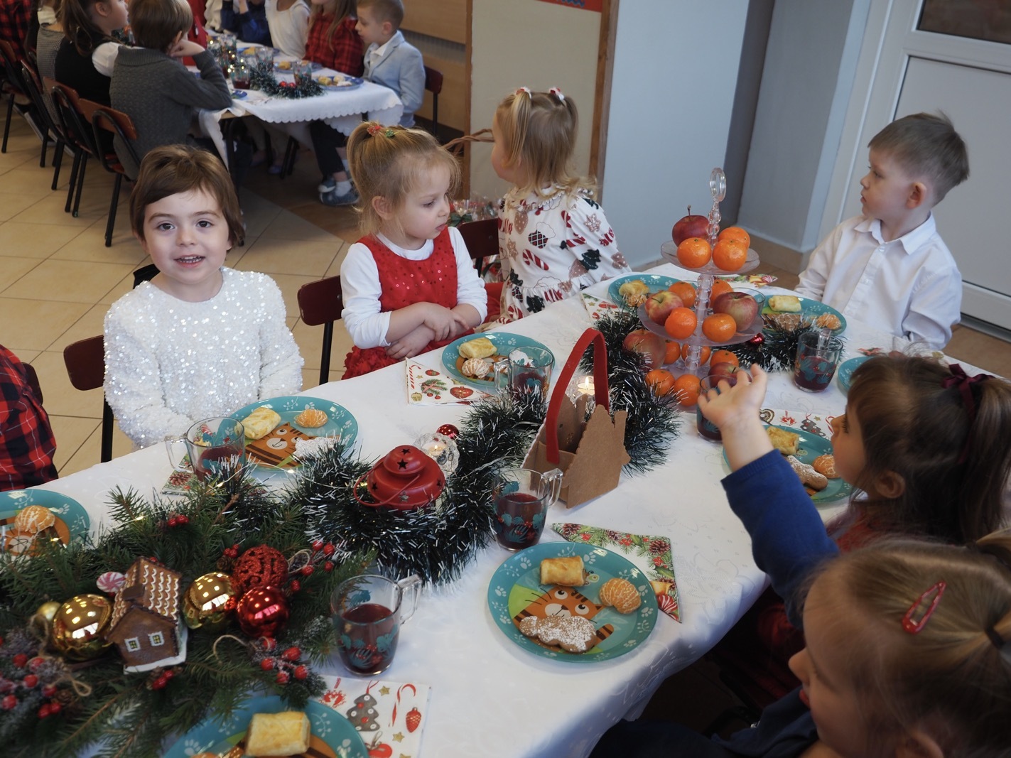 Po pięknych i wzruszających występach dzieci przyszedł czas na życzenia, dzielenie się opłatkiem i wspólne kolędowanie przy wigilijnym stole. Wspólne śpiewanie przy wigilijnym stole niesie radość oraz poczucie bliskości i jedności. Ten dzień długo zostanie w pamięci dzieci i całego personelu. Było cudownie, radośnie i rodzinnie, po prostu magia świąt