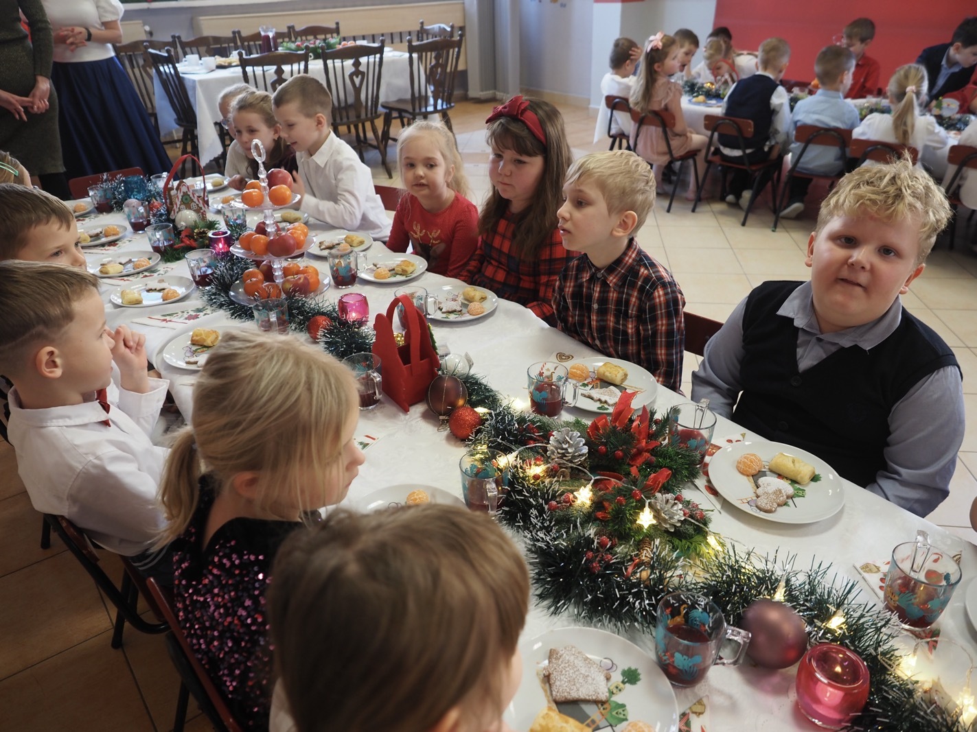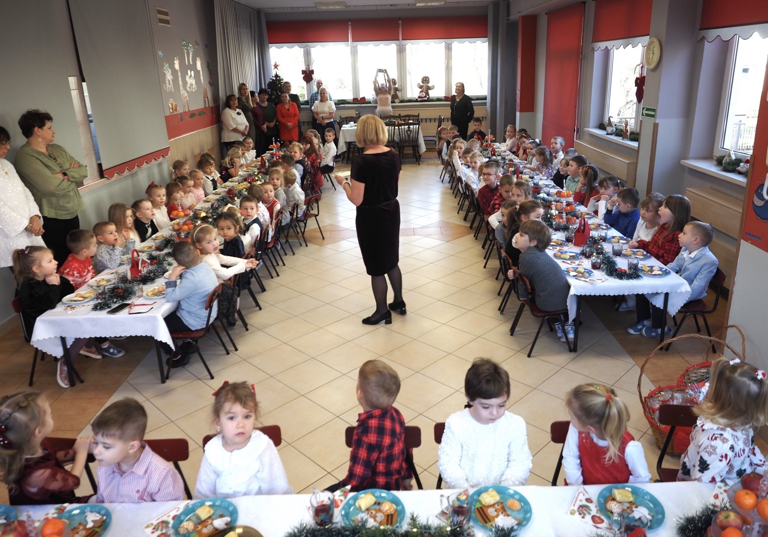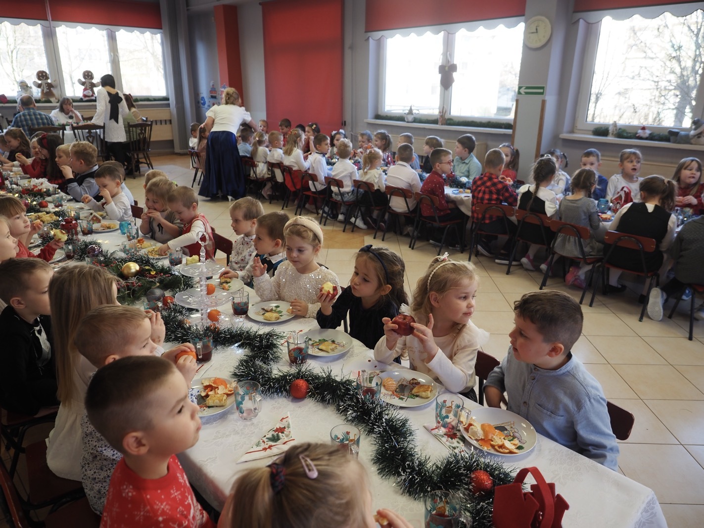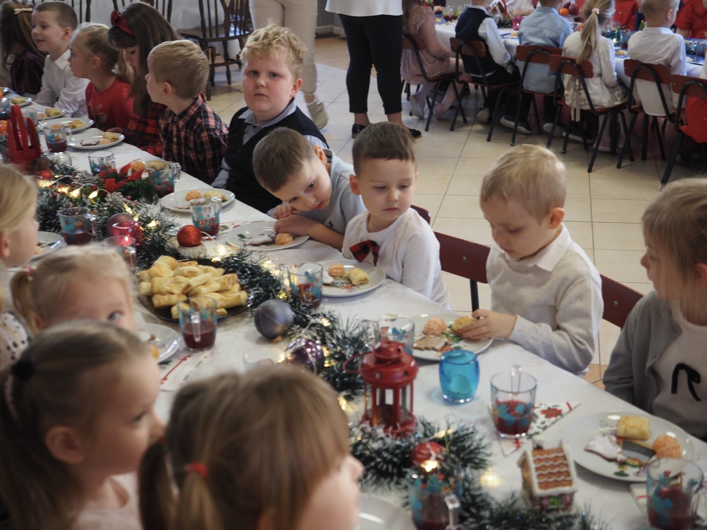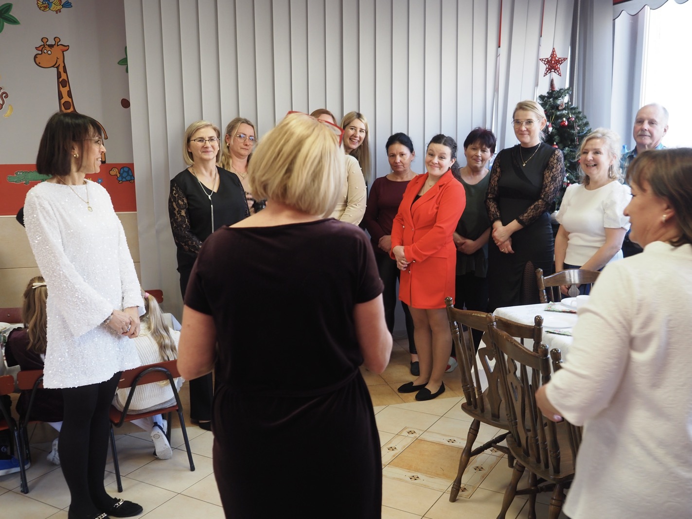Po pięknych i wzruszających występach dzieci przyszedł czas na życzenia, dzielenie się opłatkiem i wspólne kolędowanie przy wigilijnym stole. Wspólne śpiewanie przy wigilijnym stole niesie radość oraz poczucie bliskości i jedności. Ten dzień długo zostanie w pamięci dzieci i całego personelu. Było cudownie, radośnie i rodzinnie, po prostu magia świąt