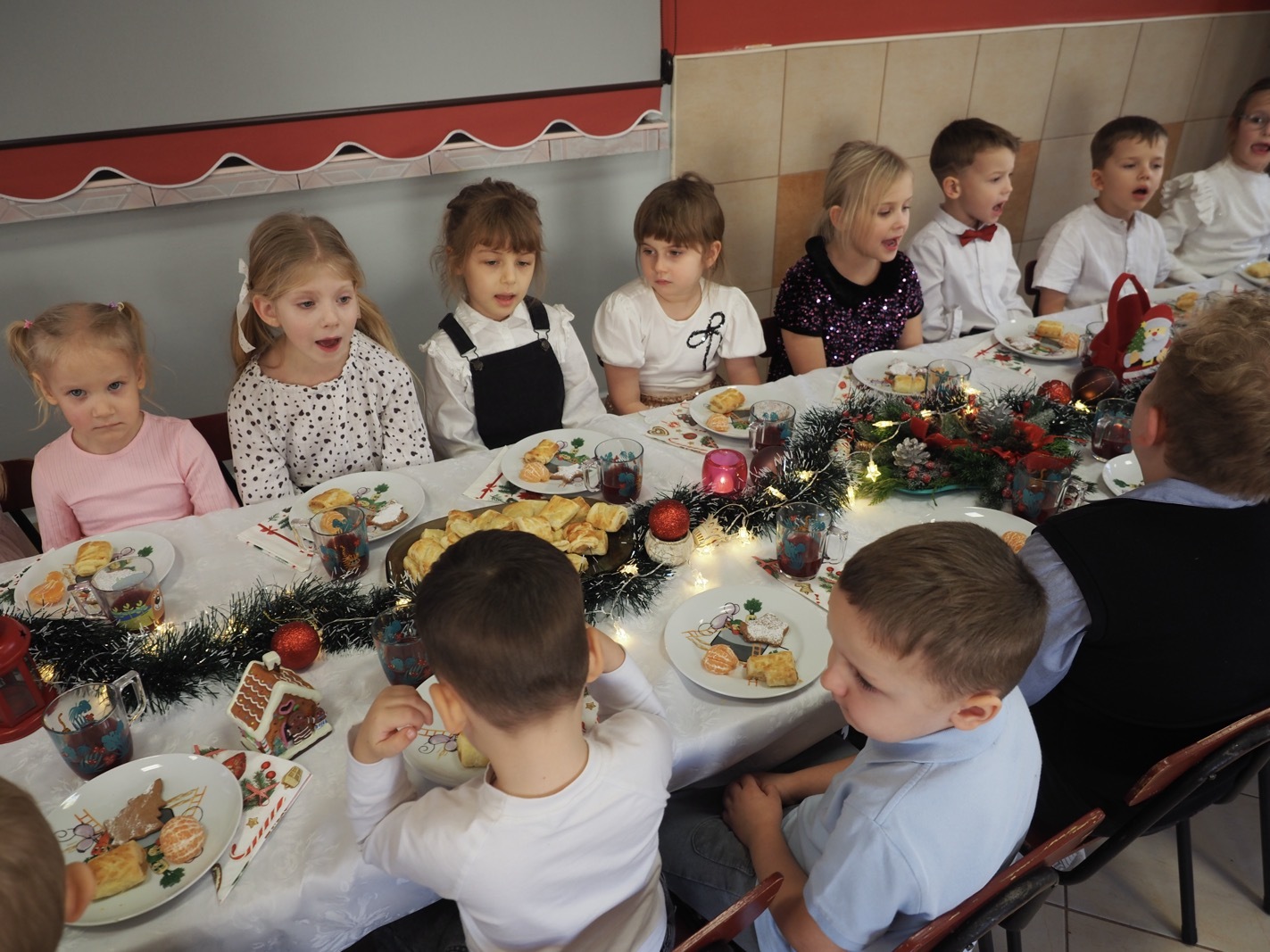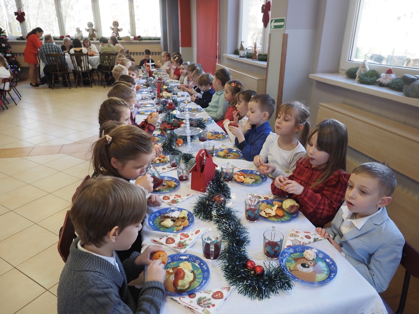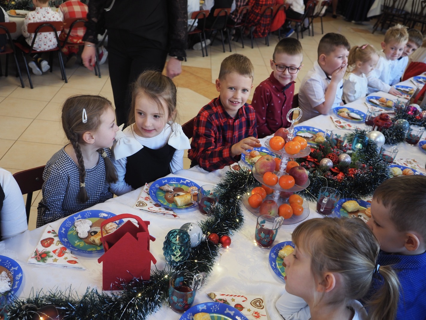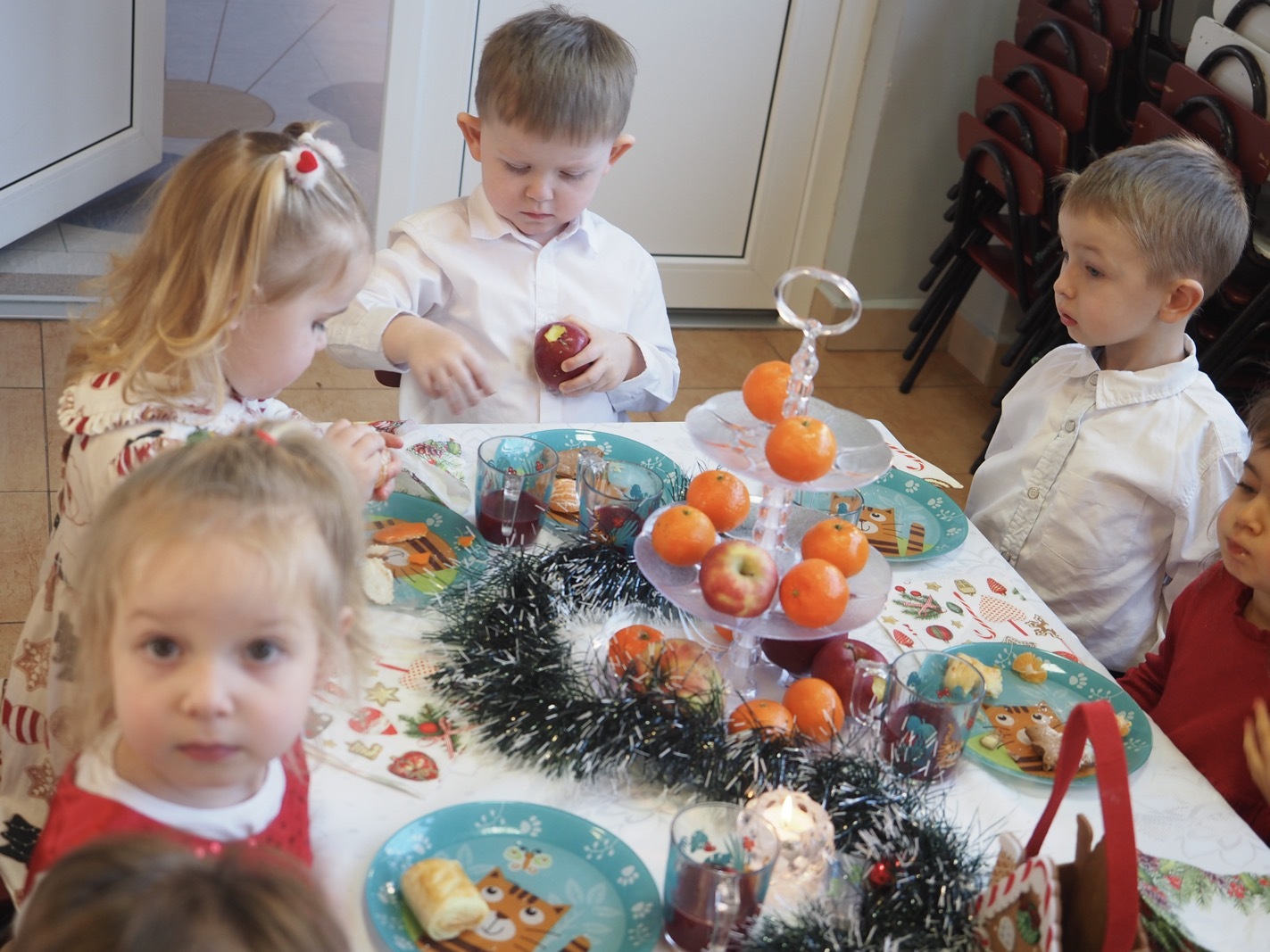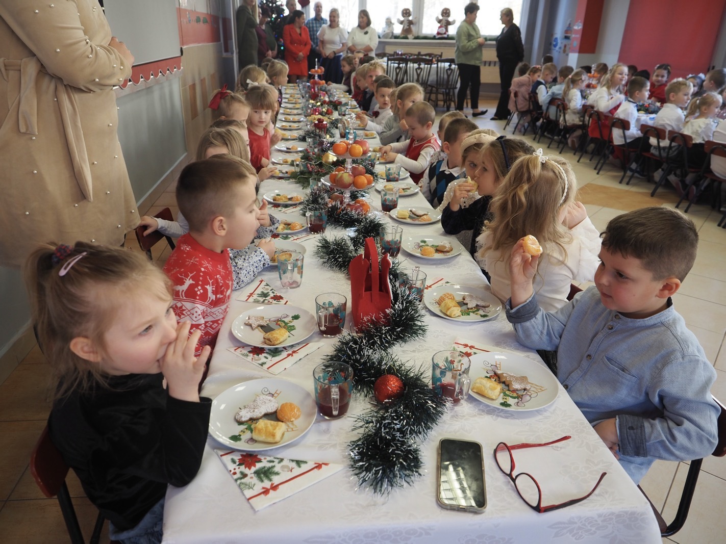 Po pięknych i wzruszających występach dzieci przyszedł czas na życzenia, dzielenie się opłatkiem i wspólne kolędowanie przy wigilijnym stole. Wspólne śpiewanie przy wigilijnym stole niesie radość oraz poczucie bliskości i jedności. Ten dzień długo zostanie w pamięci dzieci i całego personelu. Było cudownie, radośnie i rodzinnie, po prostu magia świąt