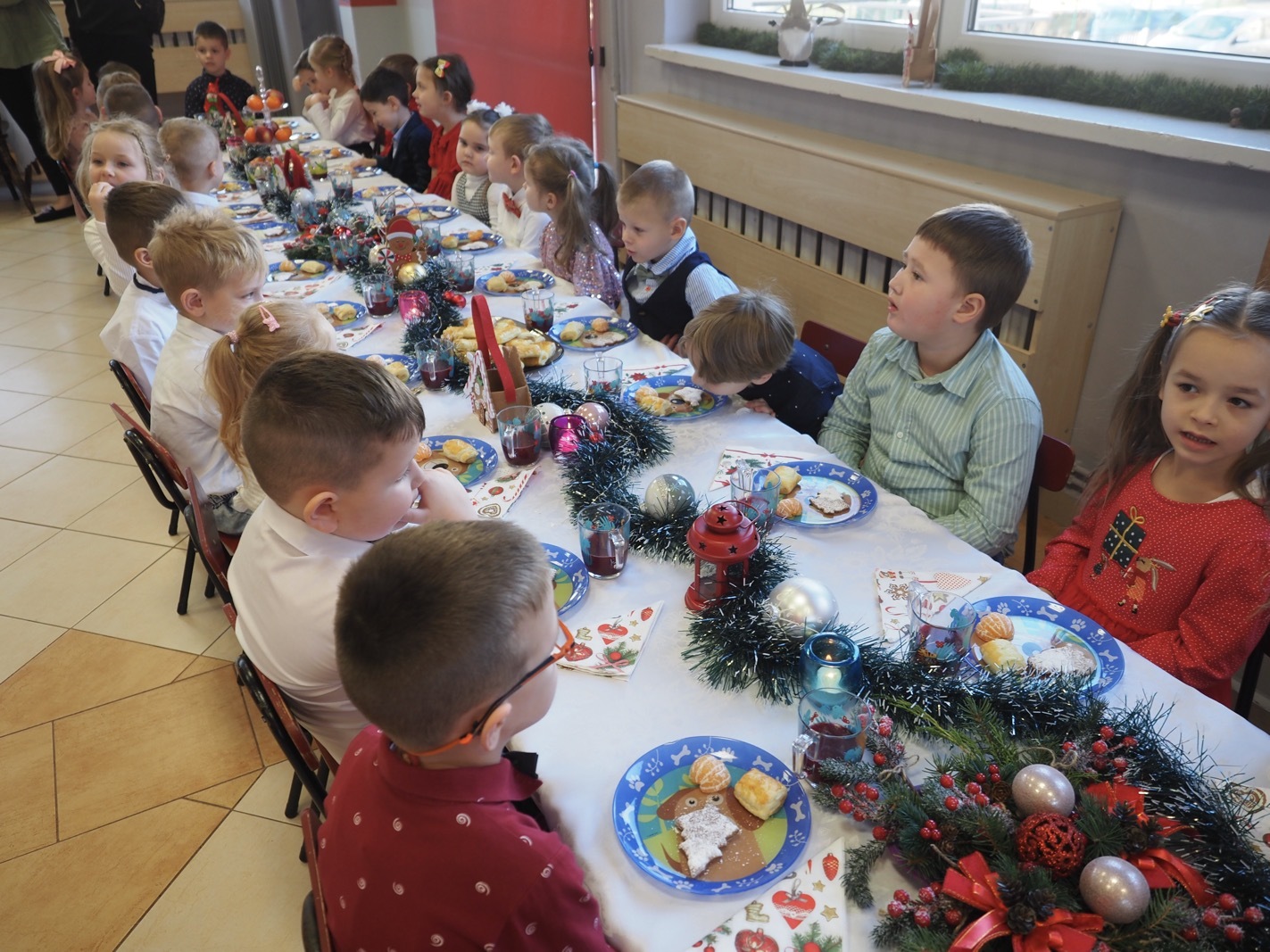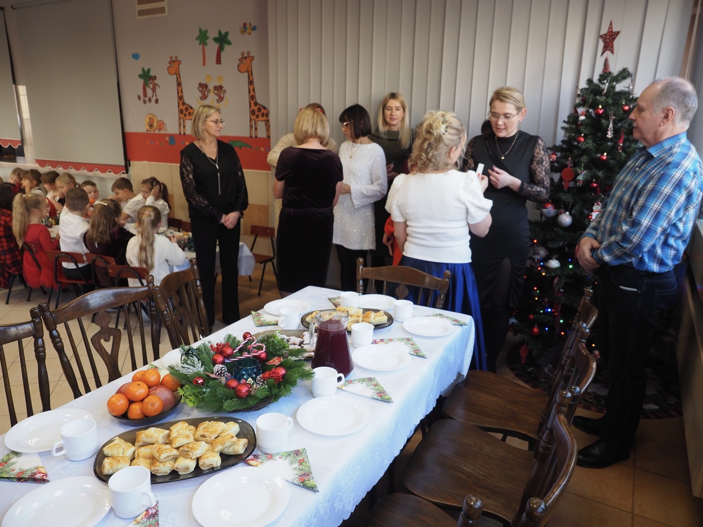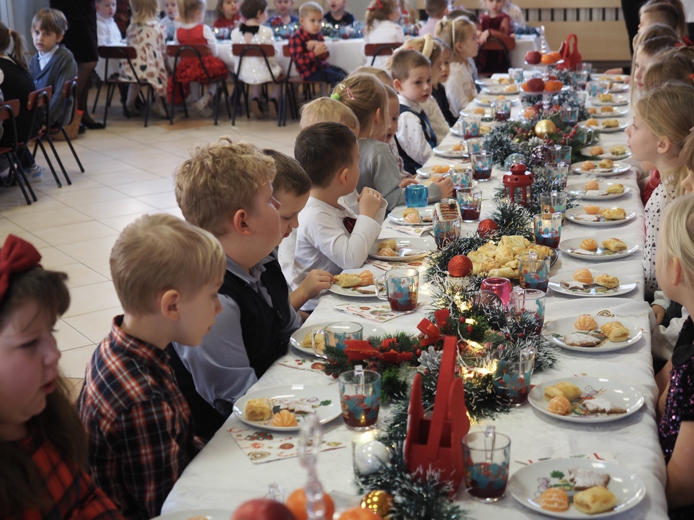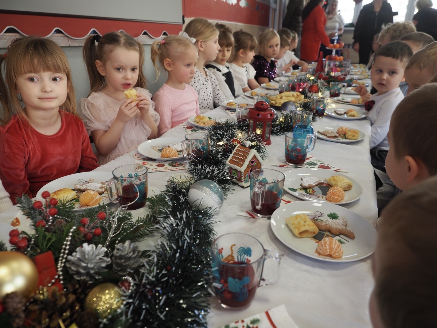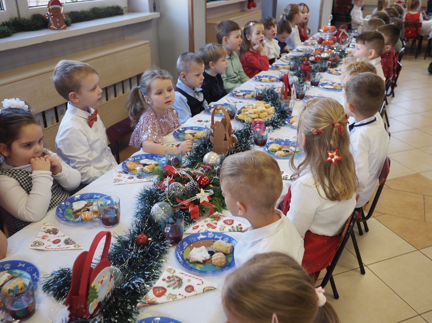 Po pięknych i wzruszających występach dzieci przyszedł czas na życzenia, dzielenie się opłatkiem i wspólne kolędowanie przy wigilijnym stole. Wspólne śpiewanie przy wigilijnym stole niesie radość oraz poczucie bliskości i jedności. Ten dzień długo zostanie w pamięci dzieci i całego personelu. Było cudownie, radośnie i rodzinnie, po prostu magia świąt
