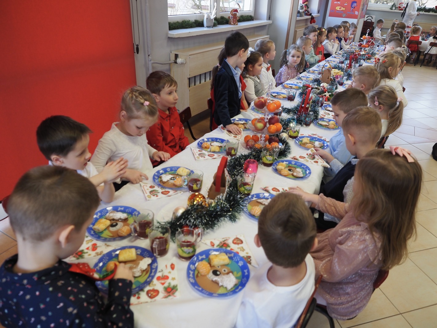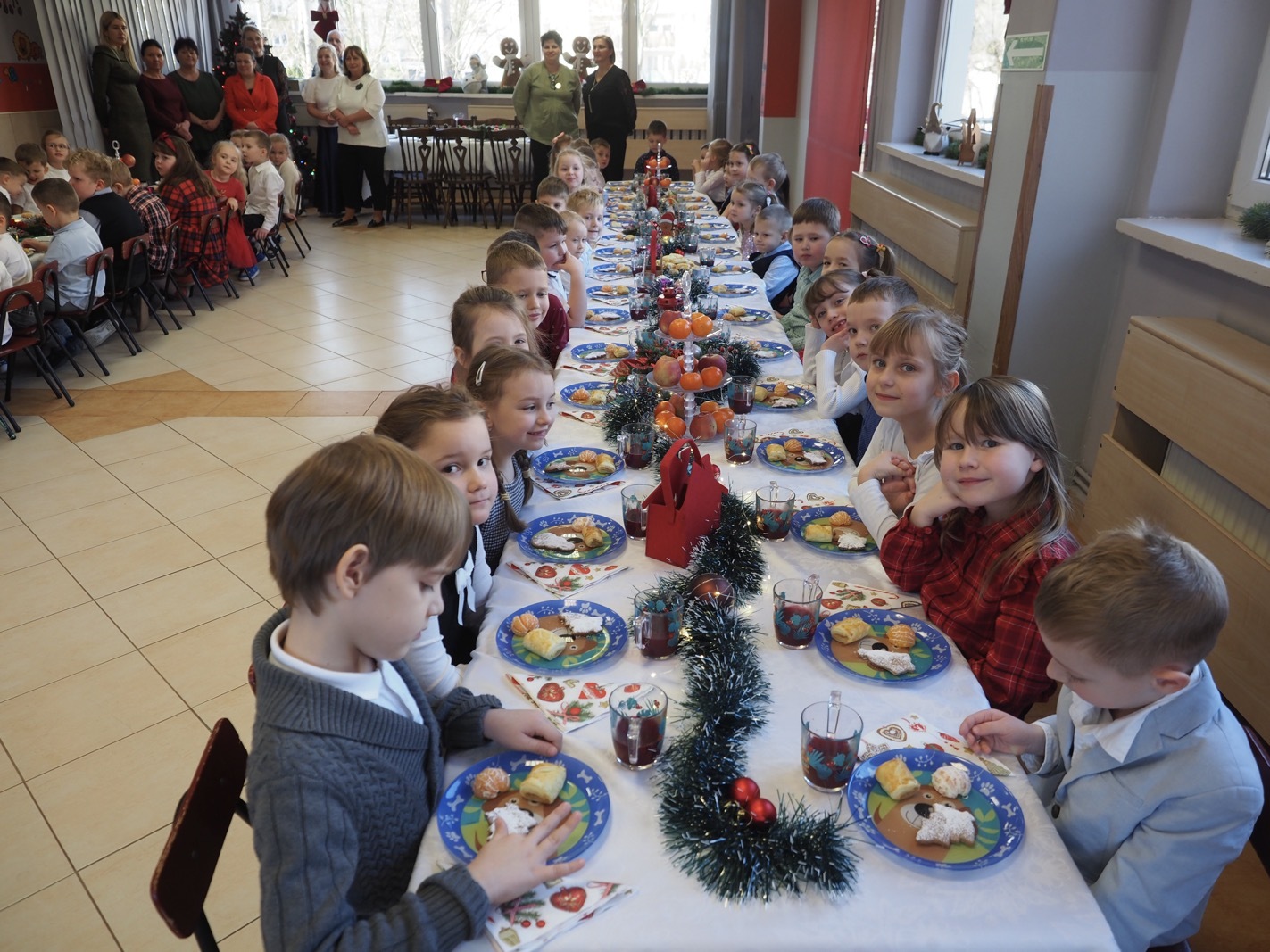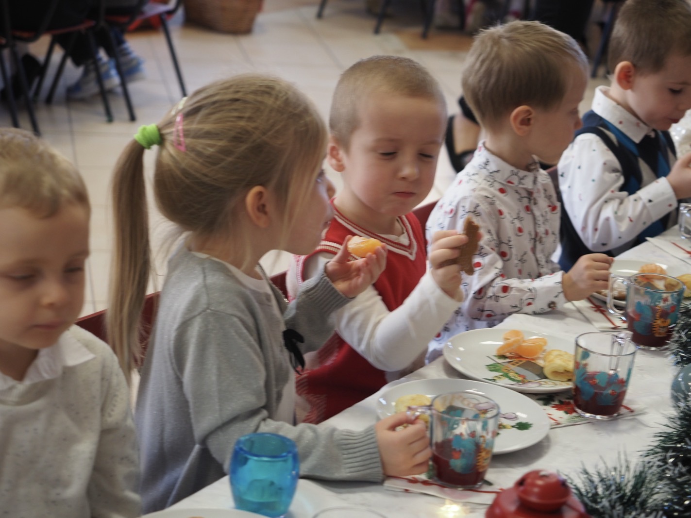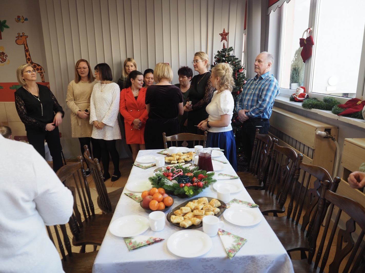 Po pięknych i wzruszających występach dzieci przyszedł czas na życzenia, dzielenie się opłatkiem i wspólne kolędowanie przy wigilijnym stole. Wspólne śpiewanie przy wigilijnym stole niesie radość oraz poczucie bliskości i jedności. Ten dzień długo zostanie w pamięci dzieci i całego personelu. Było cudownie, radośnie i rodzinnie, po prostu magia świąt