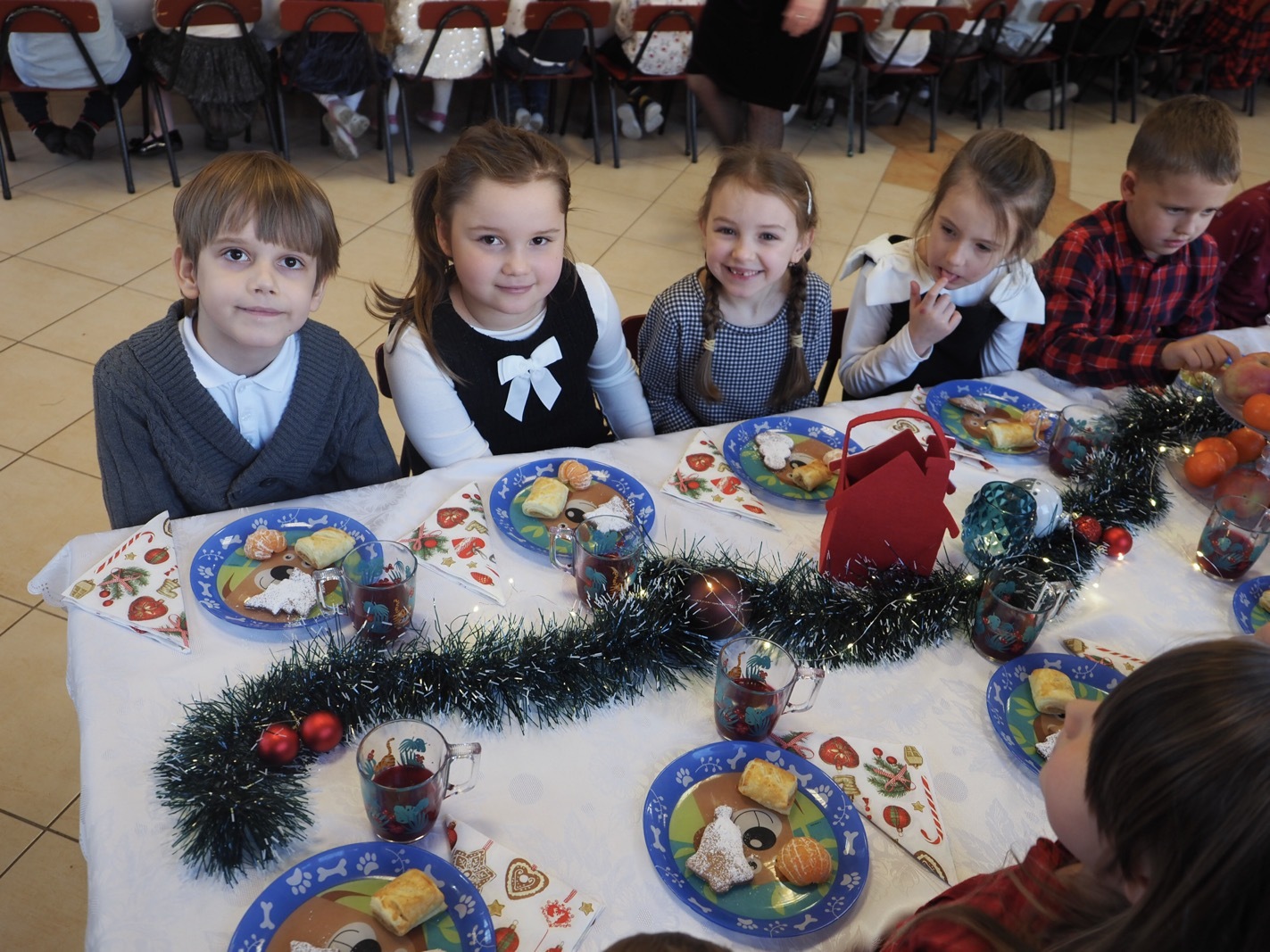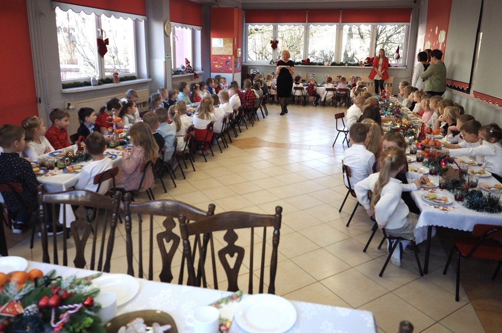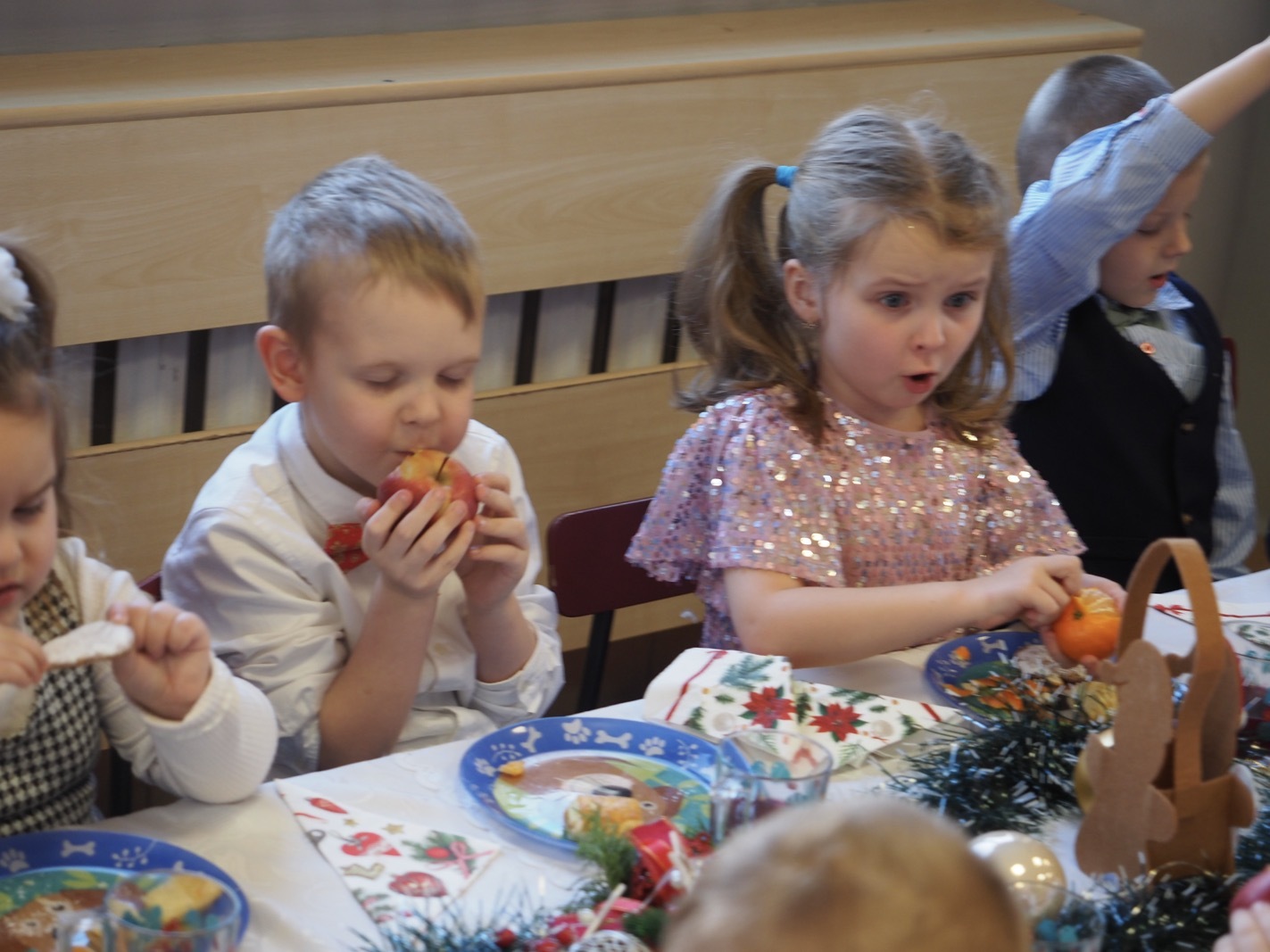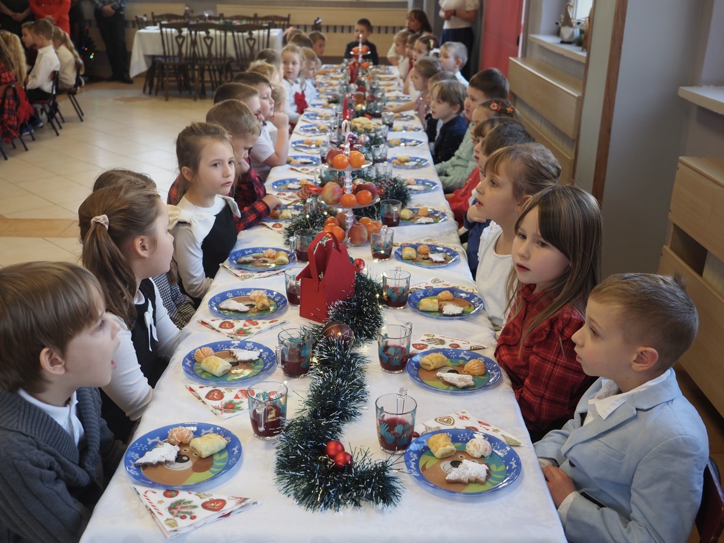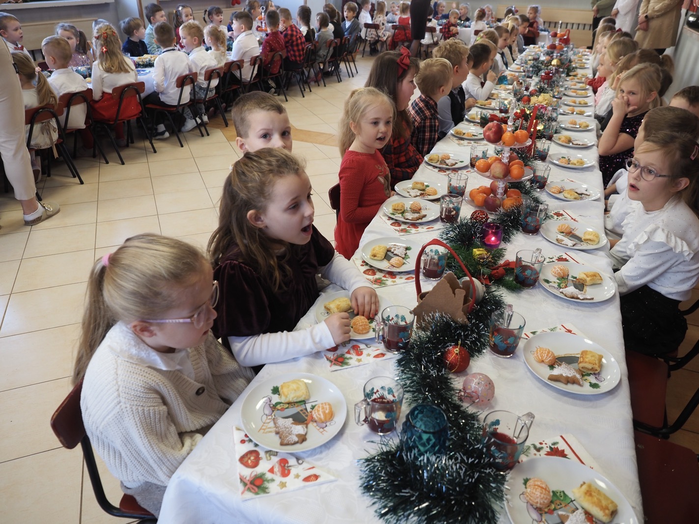 Po pięknych i wzruszających występach dzieci przyszedł czas na życzenia, dzielenie się opłatkiem i wspólne kolędowanie przy wigilijnym stole. Wspólne śpiewanie przy wigilijnym stole niesie radość oraz poczucie bliskości i jedności. Ten dzień długo zostanie w pamięci dzieci i całego personelu. Było cudownie, radośnie i rodzinnie, po prostu magia świąt