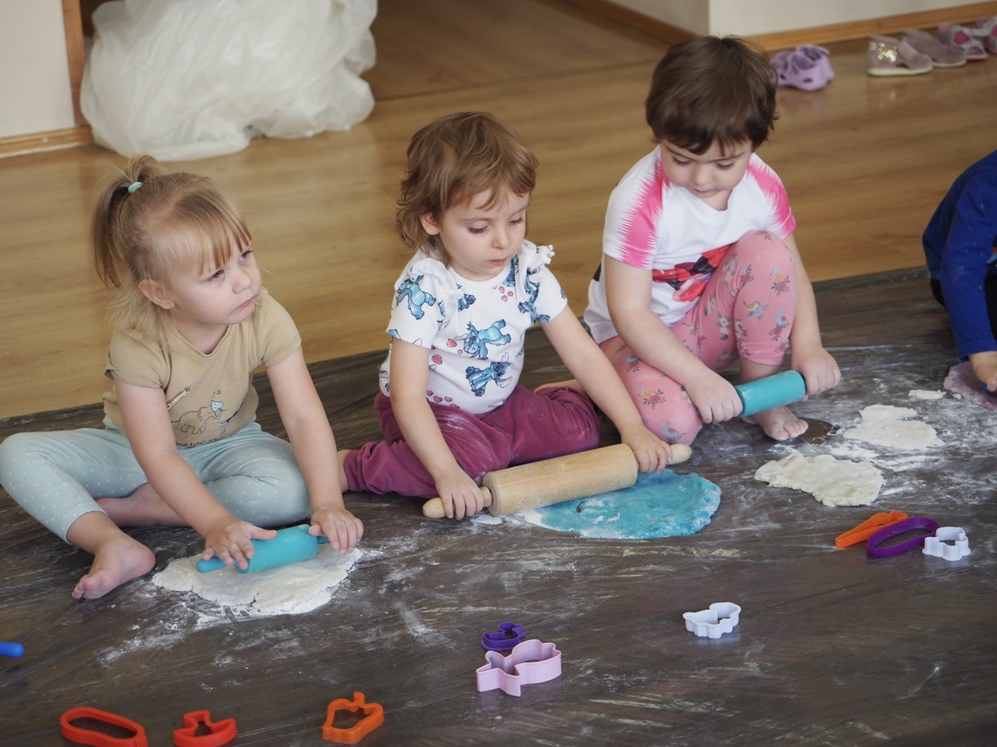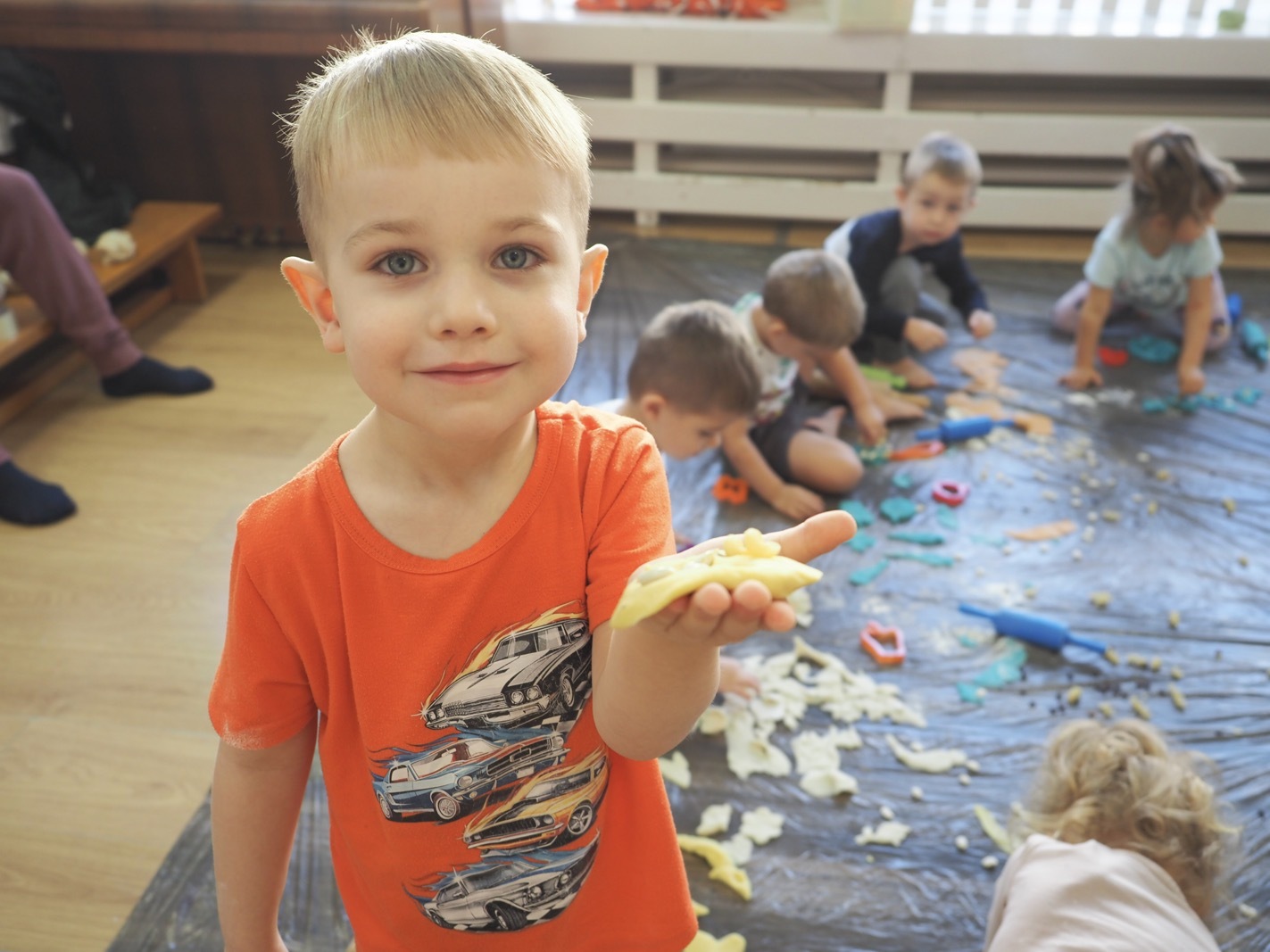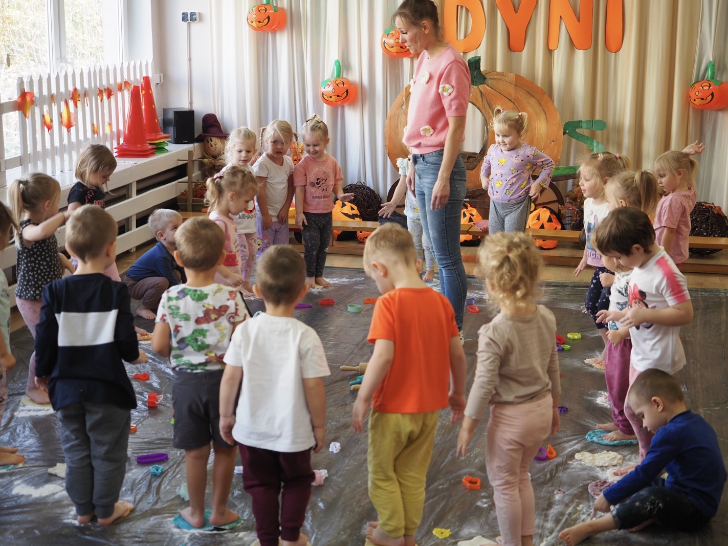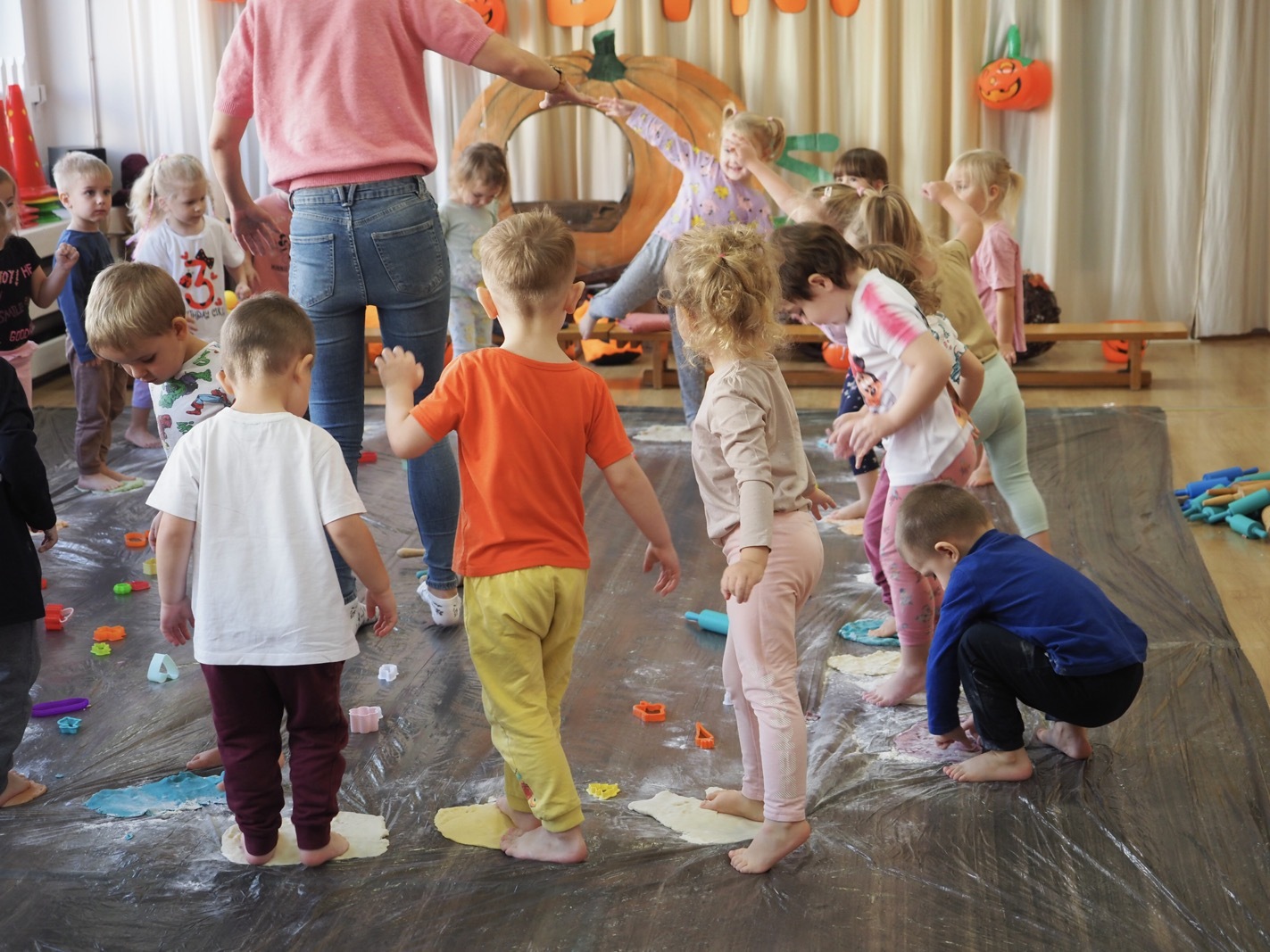 Sensoplastyka - grupa 1. Celem zajęć jest stymulacja rozwoju sensorycznego, kreatywności, samodzielności i świadomości ciała poprzez swobodną zabawę i doświadczanie.