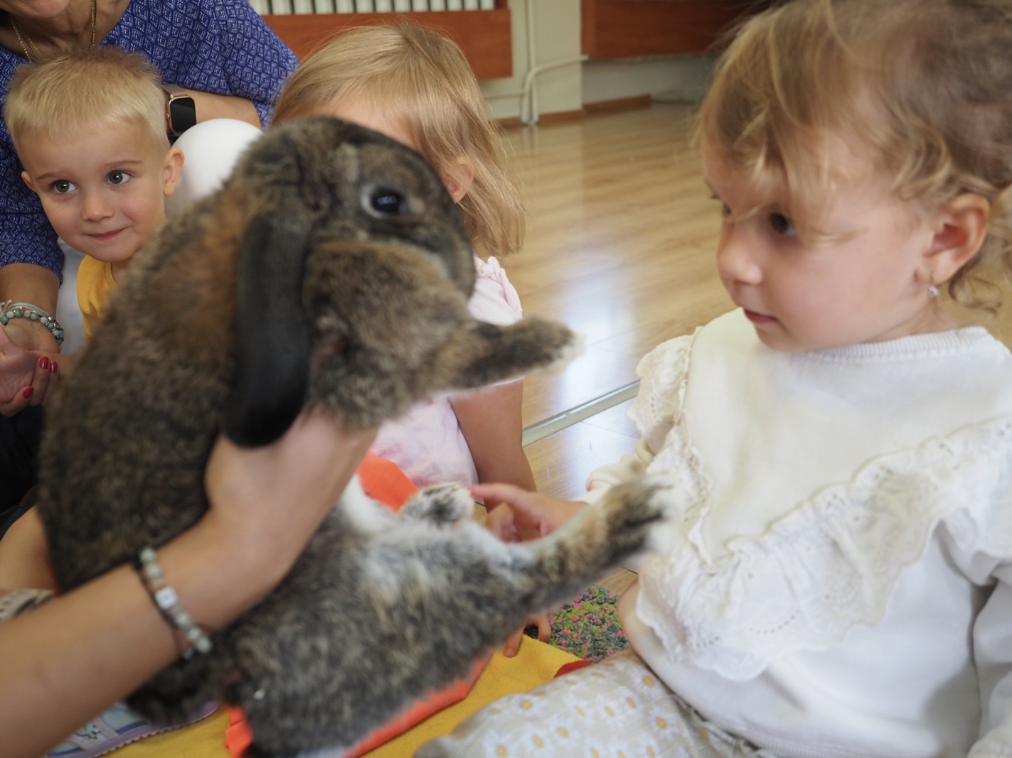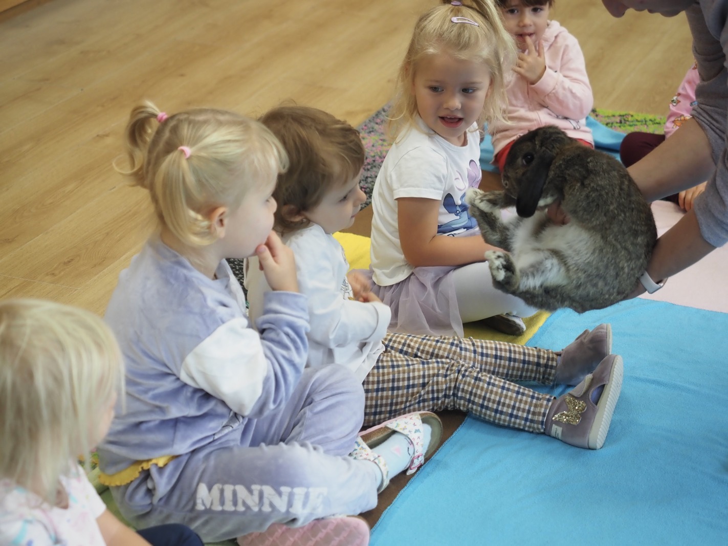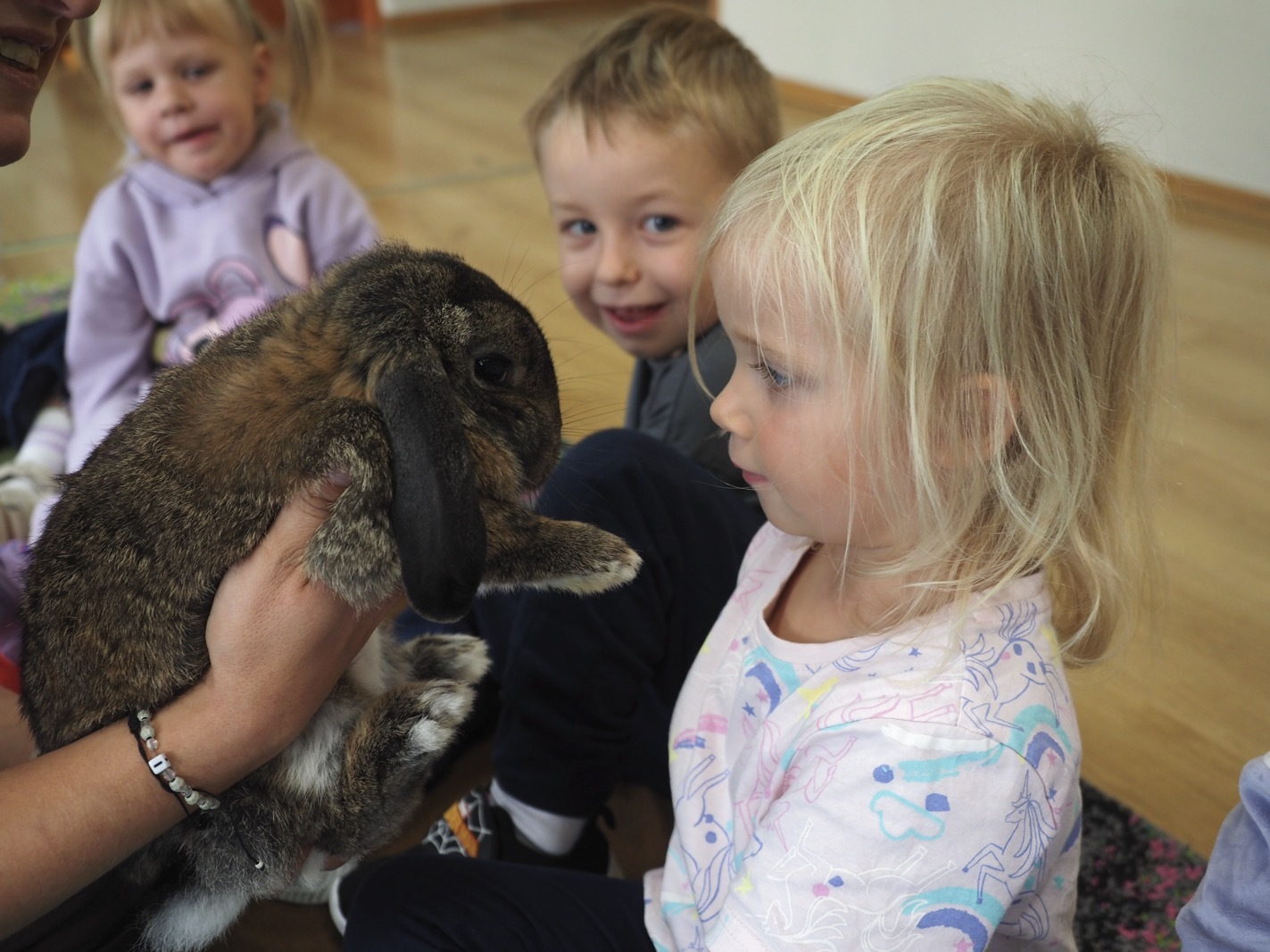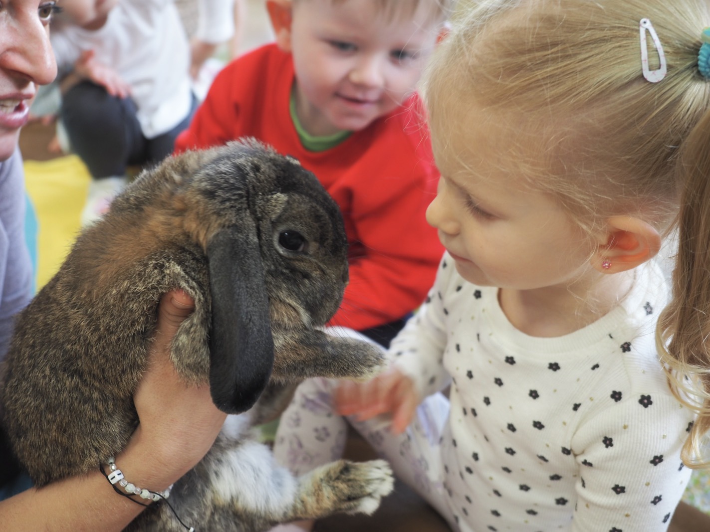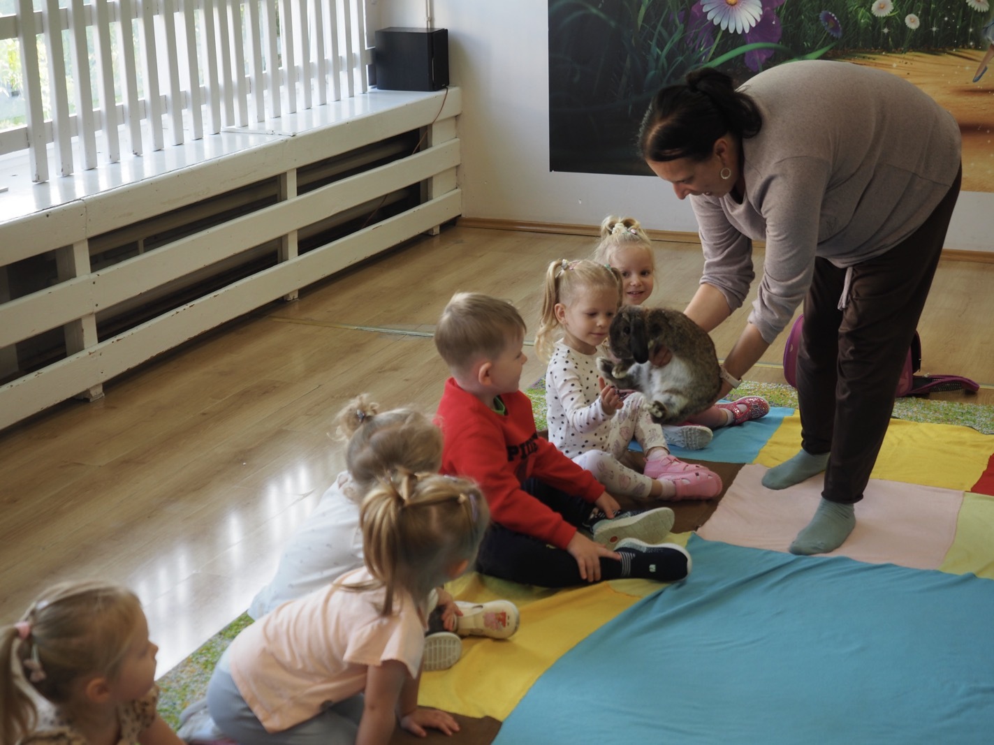 Dziś poznaliśmy cudownego króliczka - grupa 1. Każdy mógł pogłaskać zwierzątko i sprawdzić jakie ma długie i ciepłe uszka. Pierwsze w tym roku Warsztaty Przyrodnicze - Zwierzaki Cudaki. Kolejne już w październiku, wtedy poznamy inne zwierzątko.