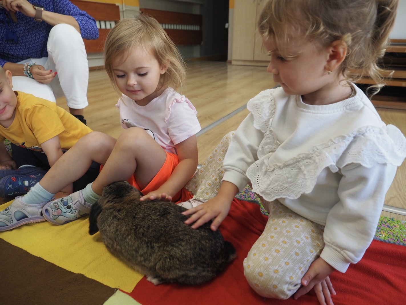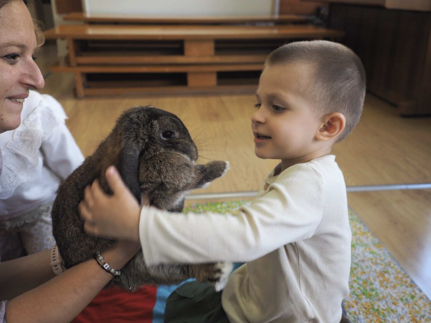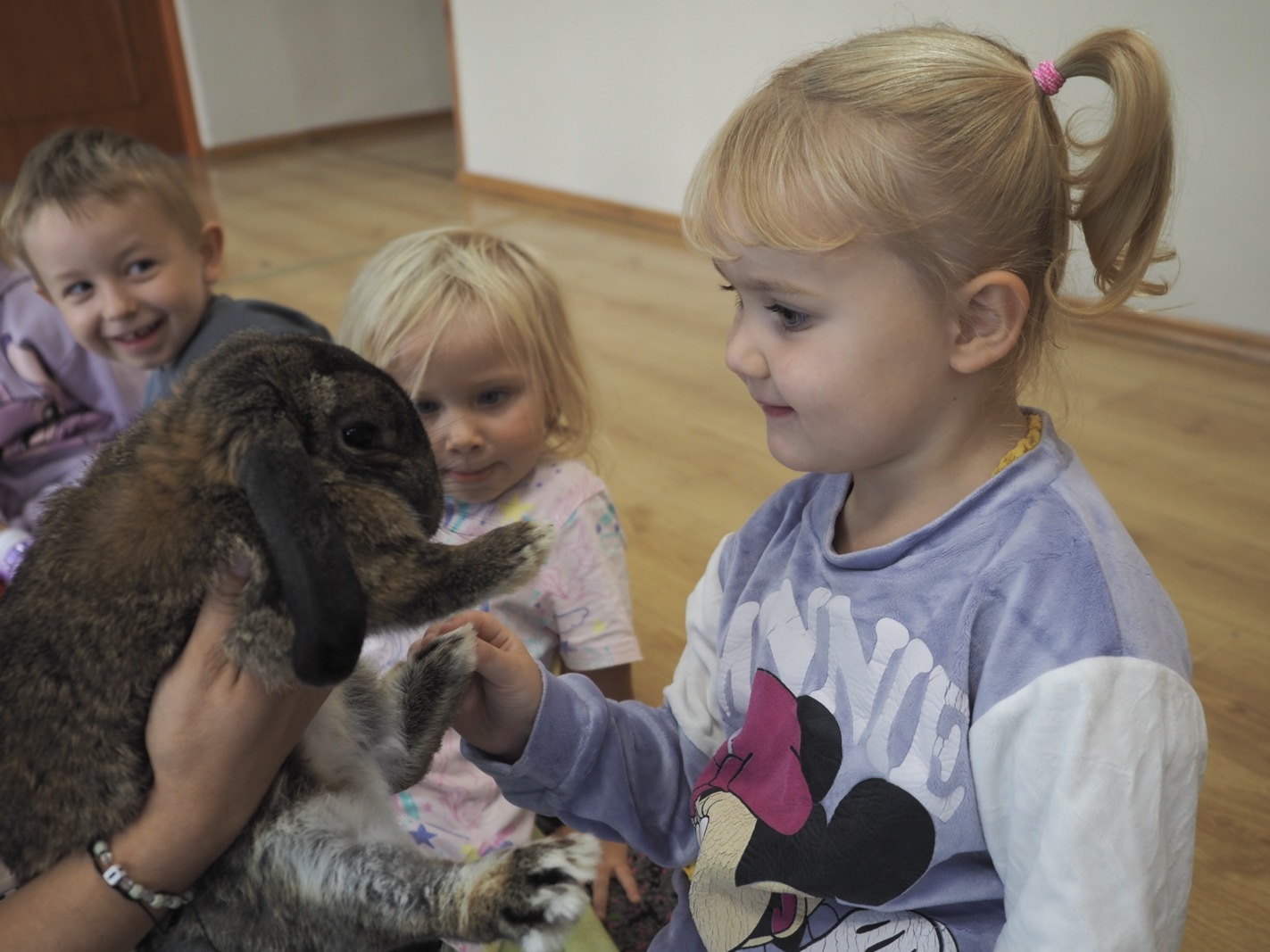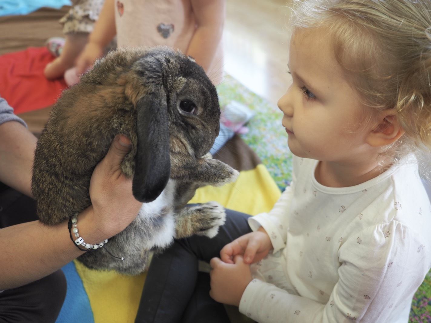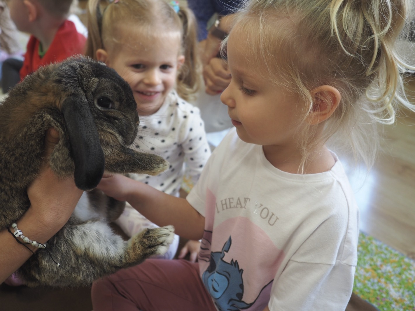 Dziś poznaliśmy cudownego króliczka - grupa 1. Każdy mógł pogłaskać zwierzątko i sprawdzić jakie ma długie i ciepłe uszka. Pierwsze w tym roku Warsztaty Przyrodnicze - Zwierzaki Cudaki. Kolejne już w październiku, wtedy poznamy inne zwierzątko.