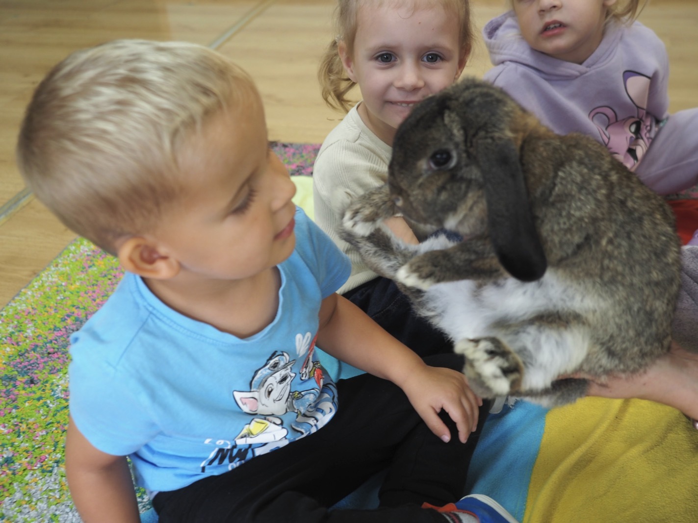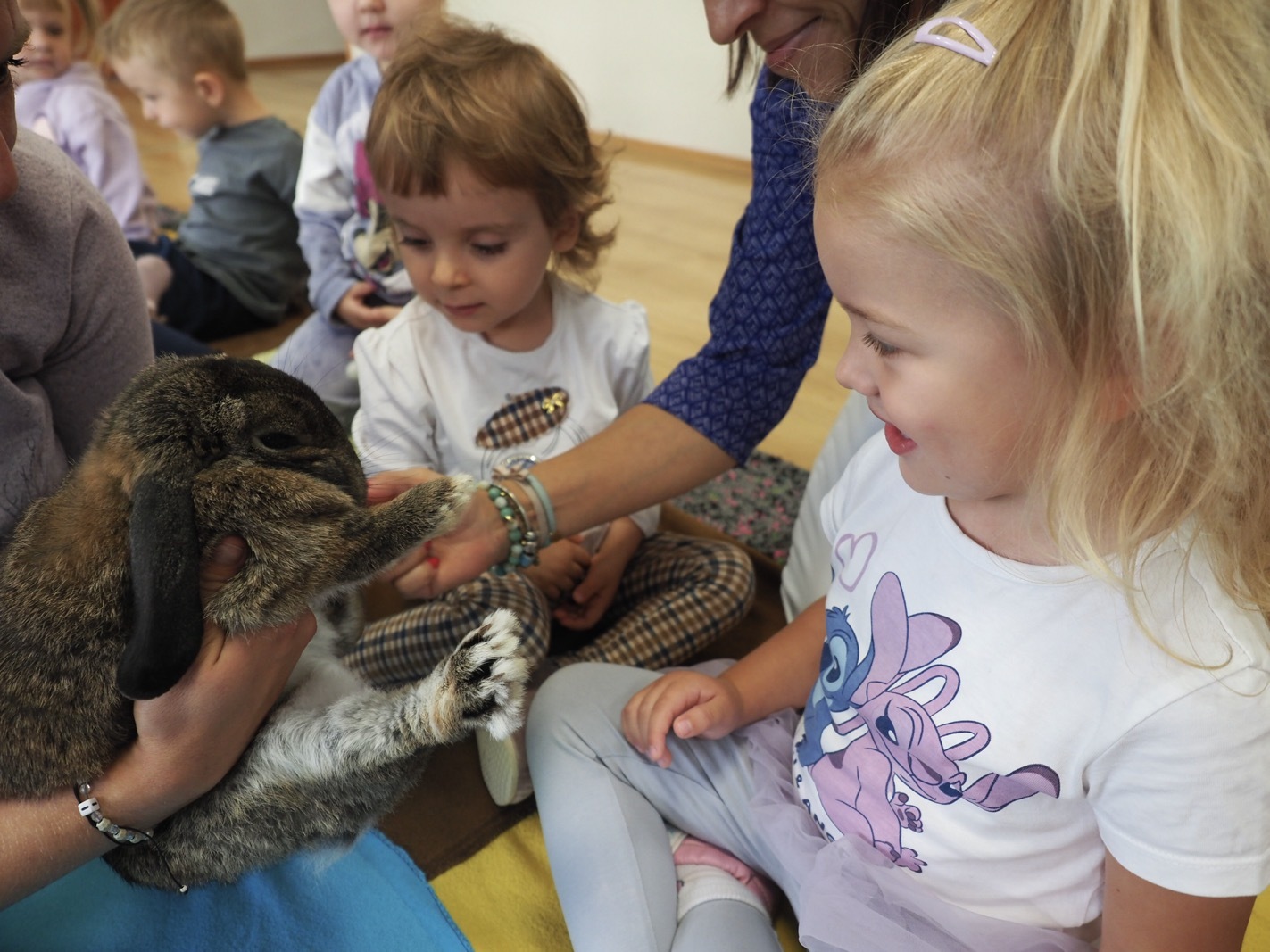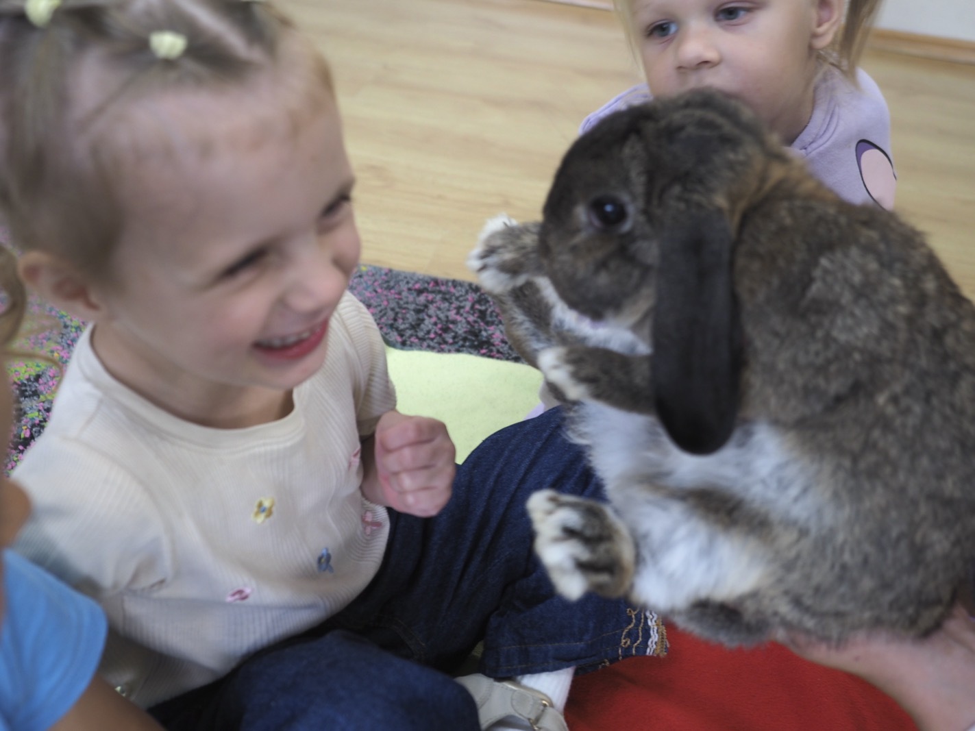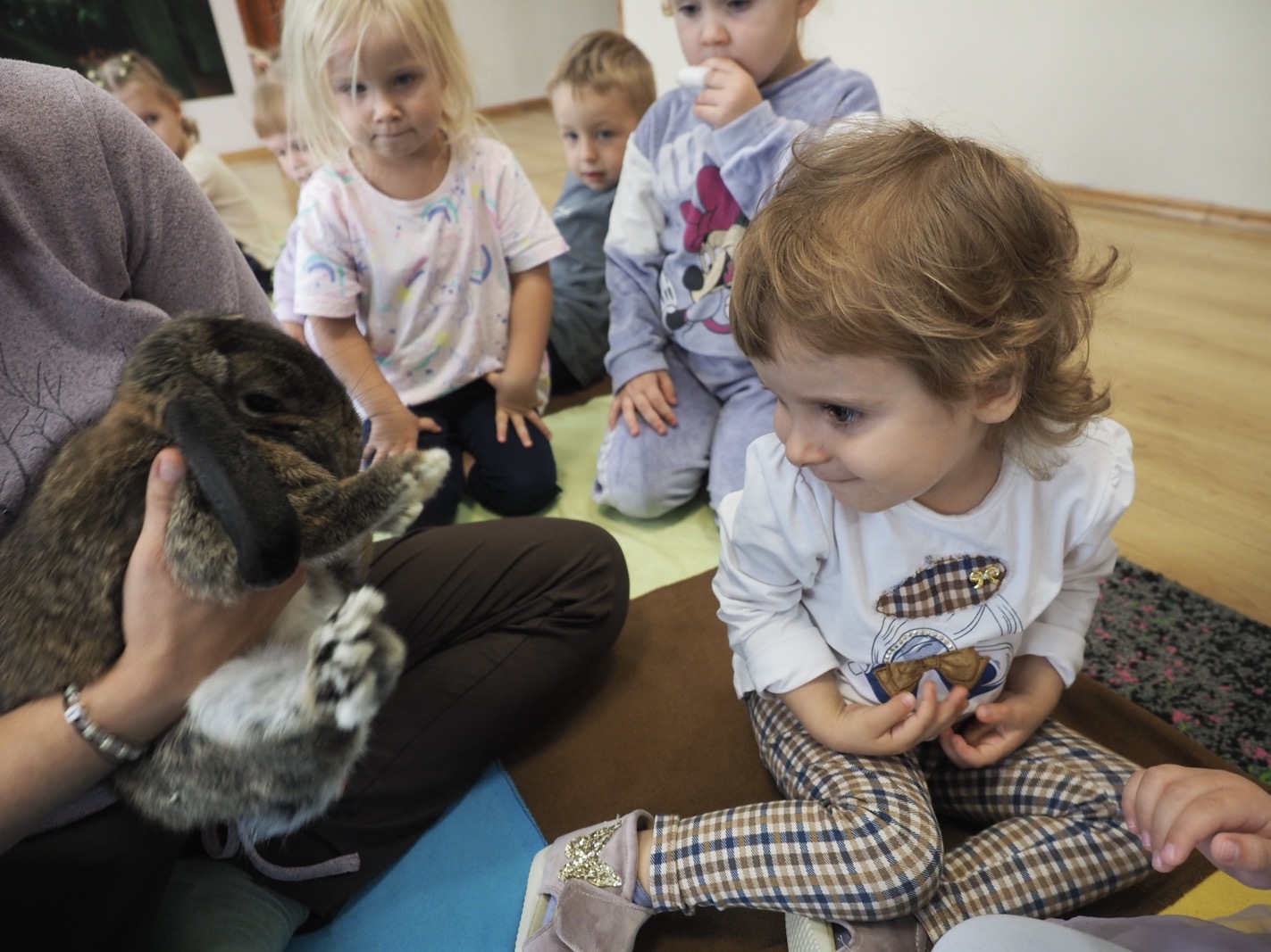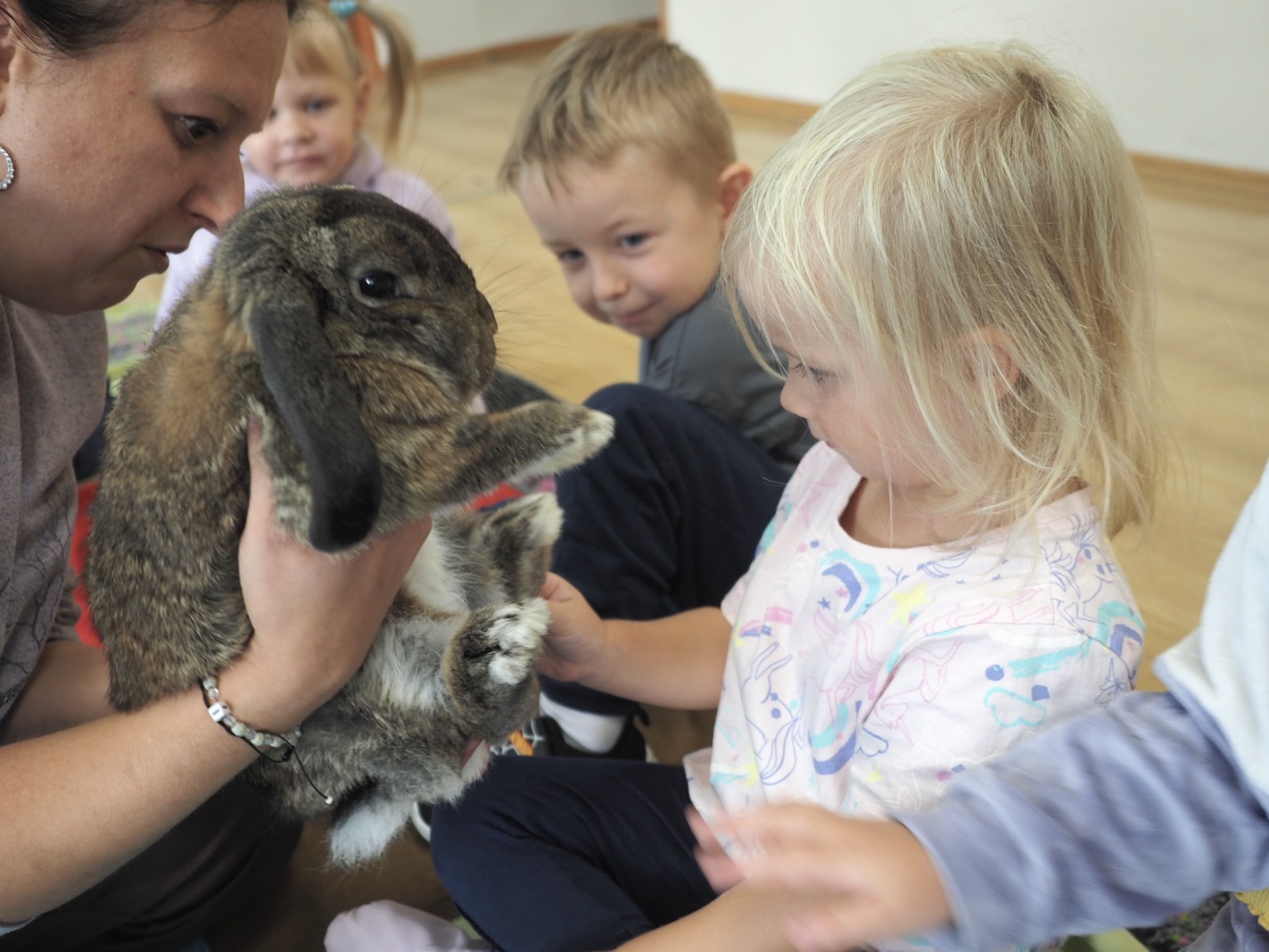 Dziś poznaliśmy cudownego króliczka - grupa 1. Każdy mógł pogłaskać zwierzątko i sprawdzić jakie ma długie i ciepłe uszka. Pierwsze w tym roku Warsztaty Przyrodnicze - Zwierzaki Cudaki. Kolejne już w październiku, wtedy poznamy inne zwierzątko.