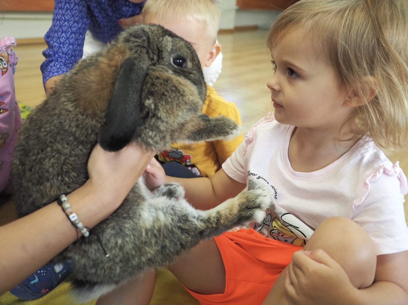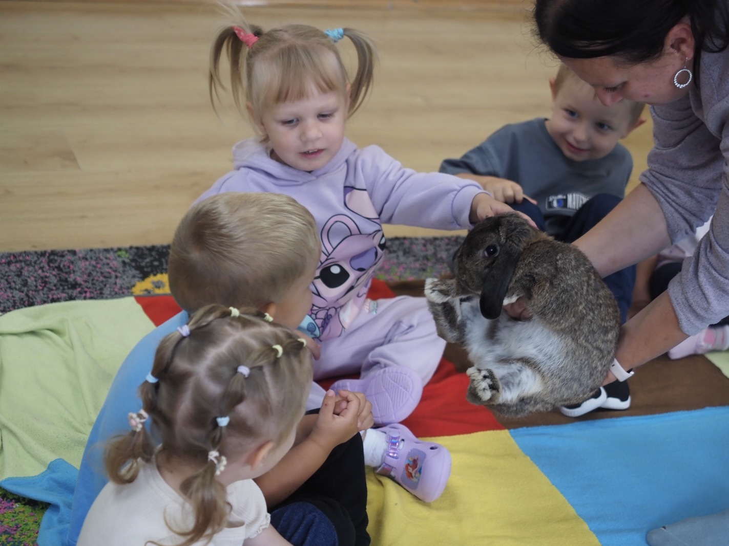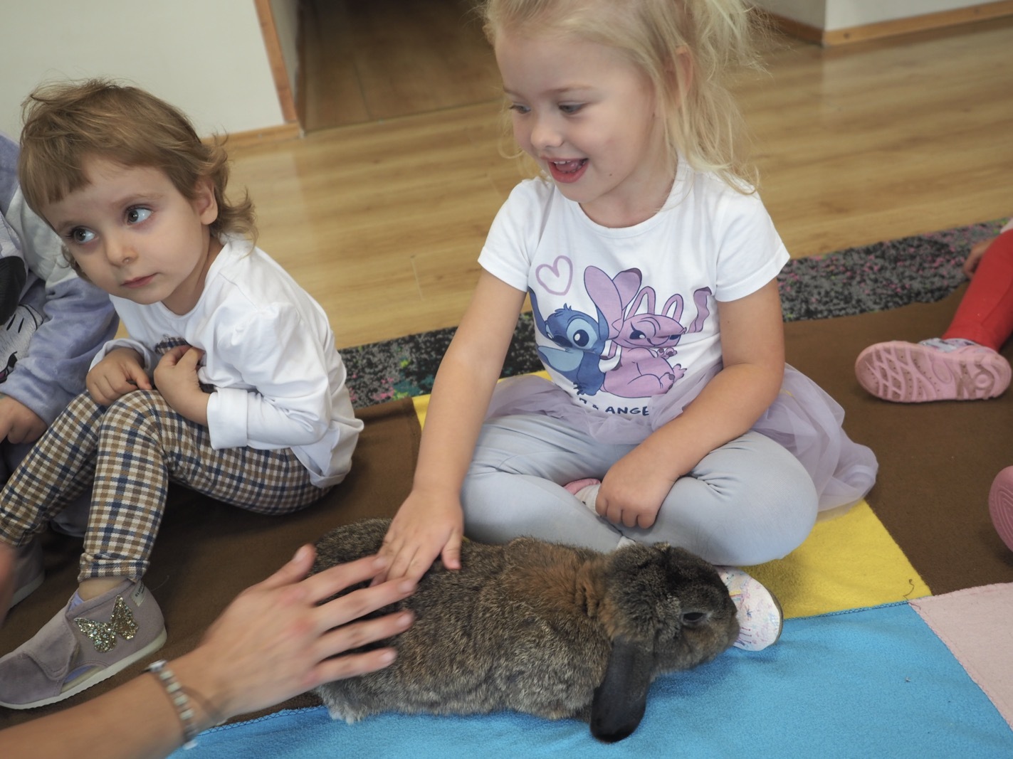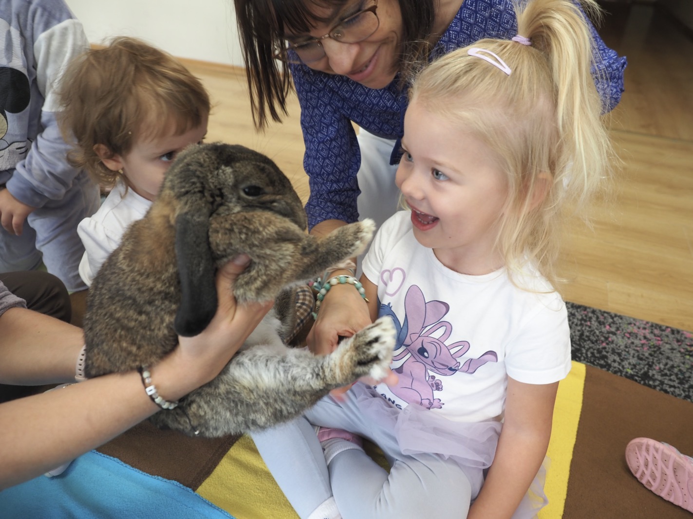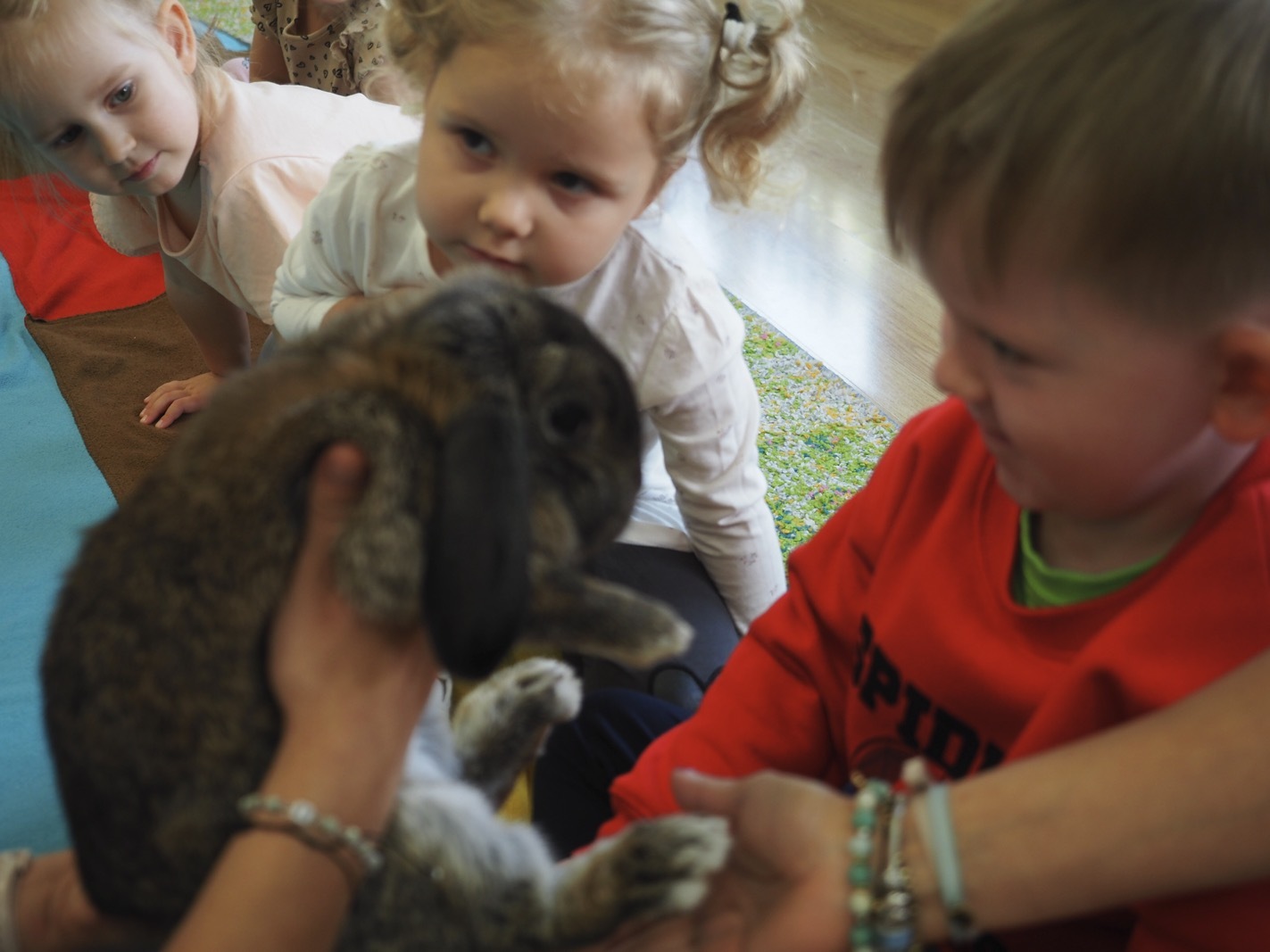 Dziś poznaliśmy cudownego króliczka - grupa 1. Każdy mógł pogłaskać zwierzątko i sprawdzić jakie ma długie i ciepłe uszka. Pierwsze w tym roku Warsztaty Przyrodnicze - Zwierzaki Cudaki. Kolejne już w październiku, wtedy poznamy inne zwierzątko.