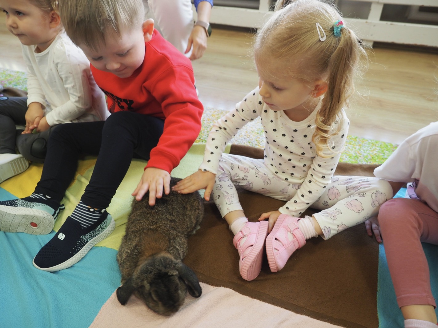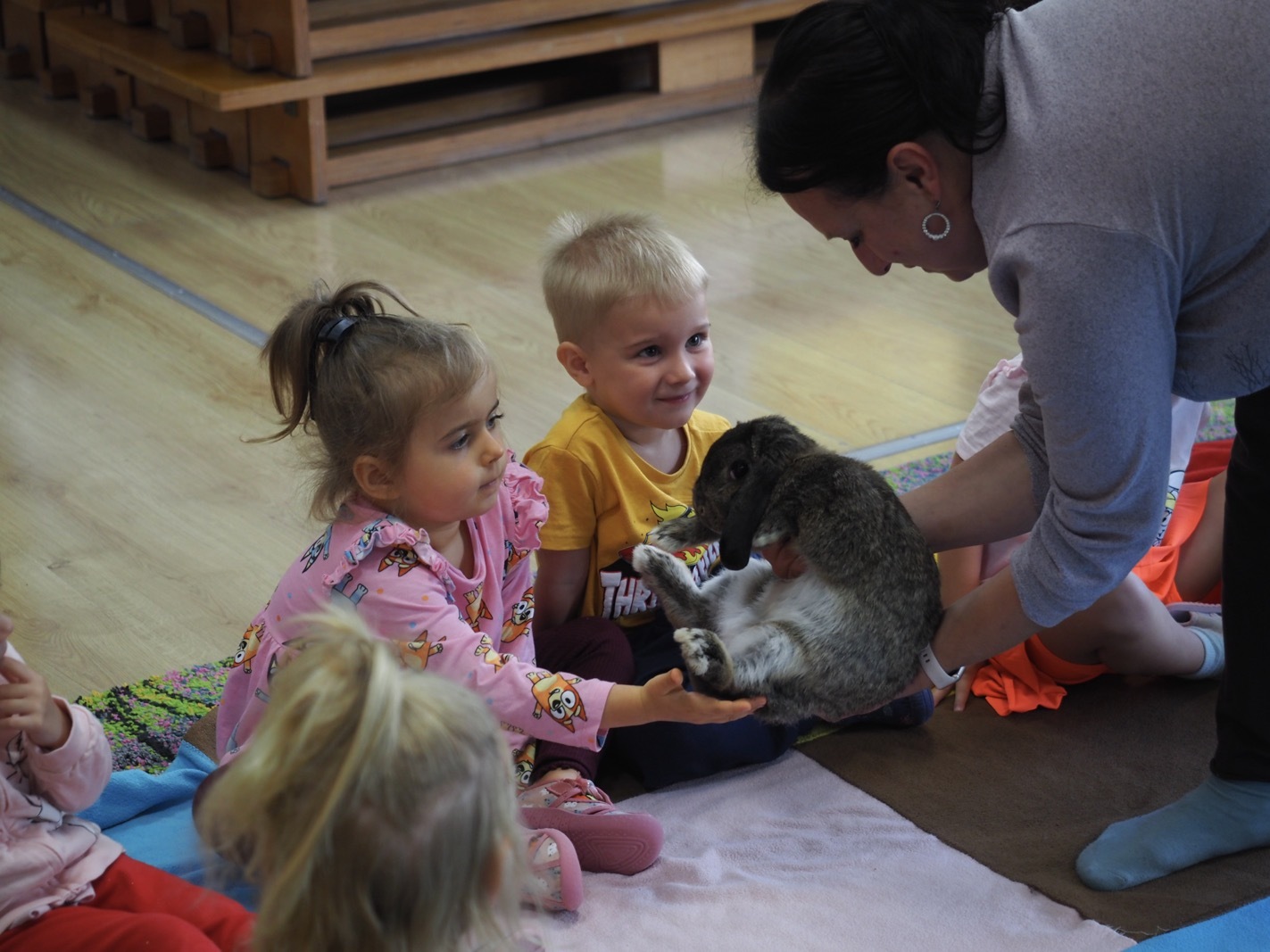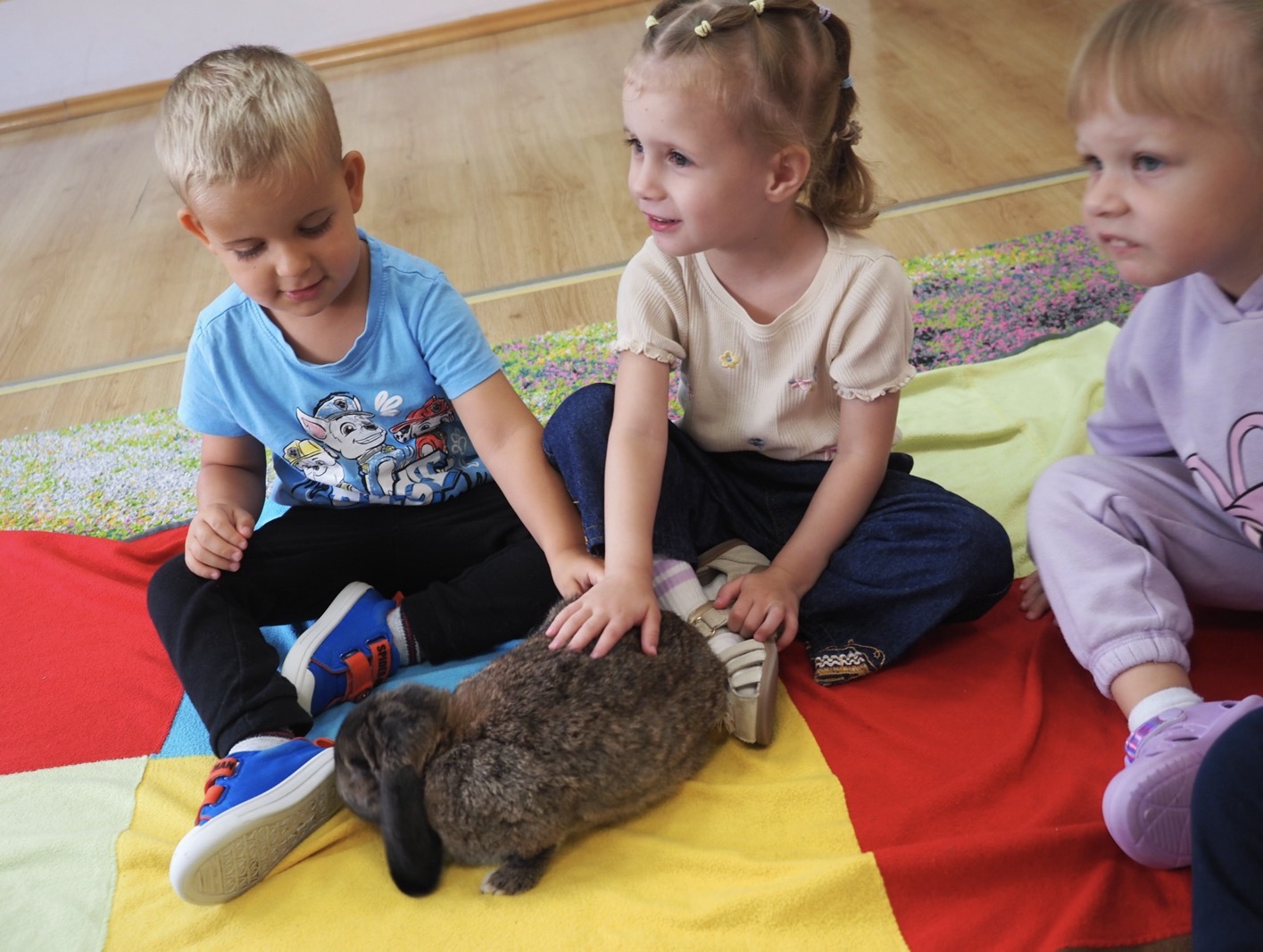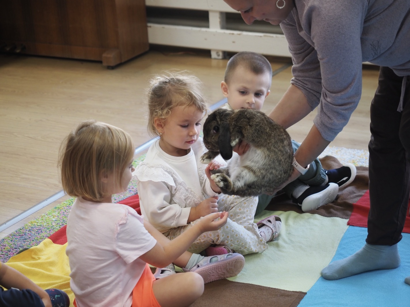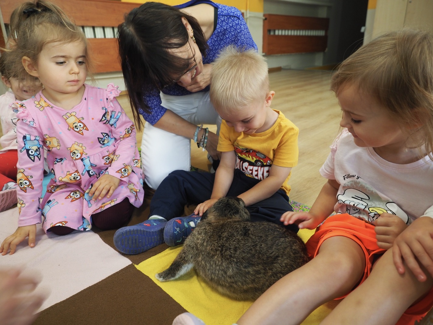 Dziś poznaliśmy cudownego króliczka - grupa 1. Każdy mógł pogłaskać zwierzątko i sprawdzić jakie ma długie i ciepłe uszka. Pierwsze w tym roku Warsztaty Przyrodnicze - Zwierzaki Cudaki. Kolejne już w październiku, wtedy poznamy inne zwierzątko.