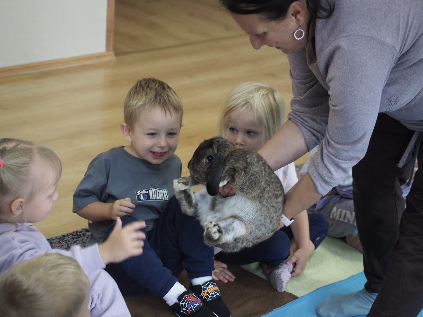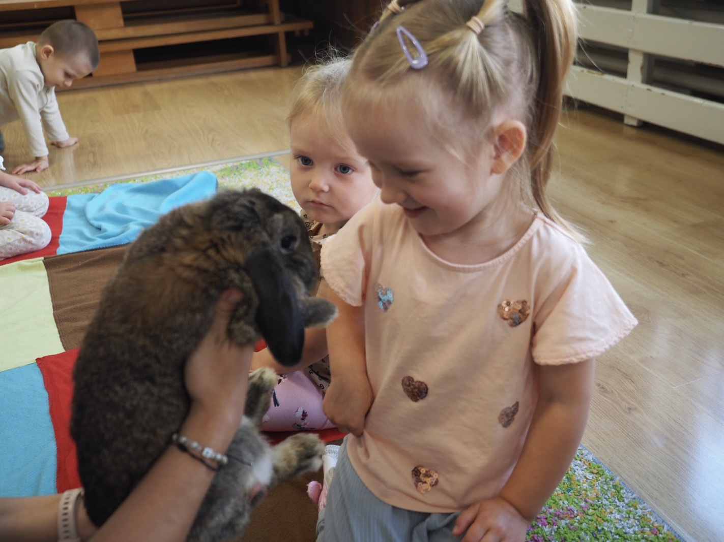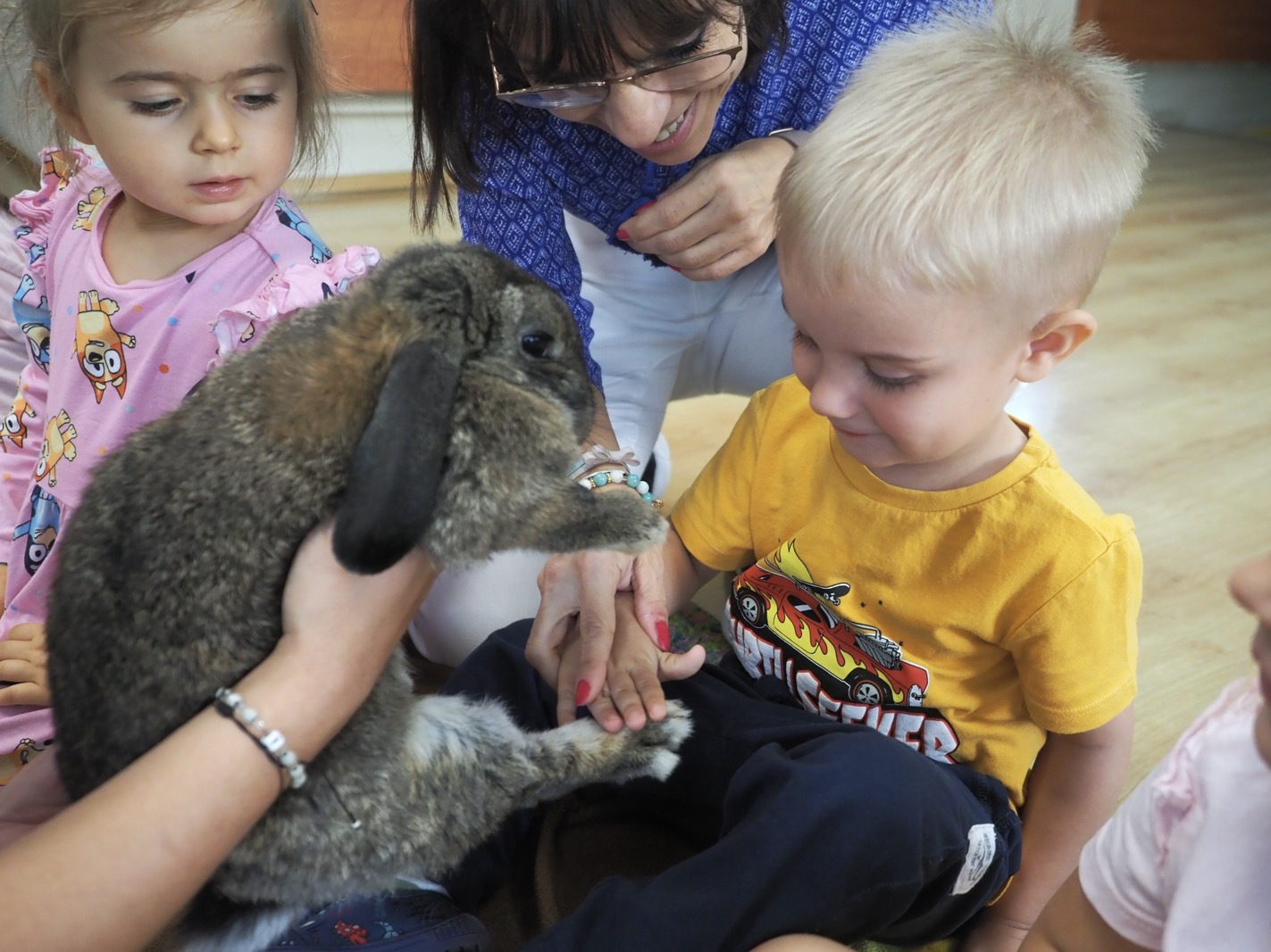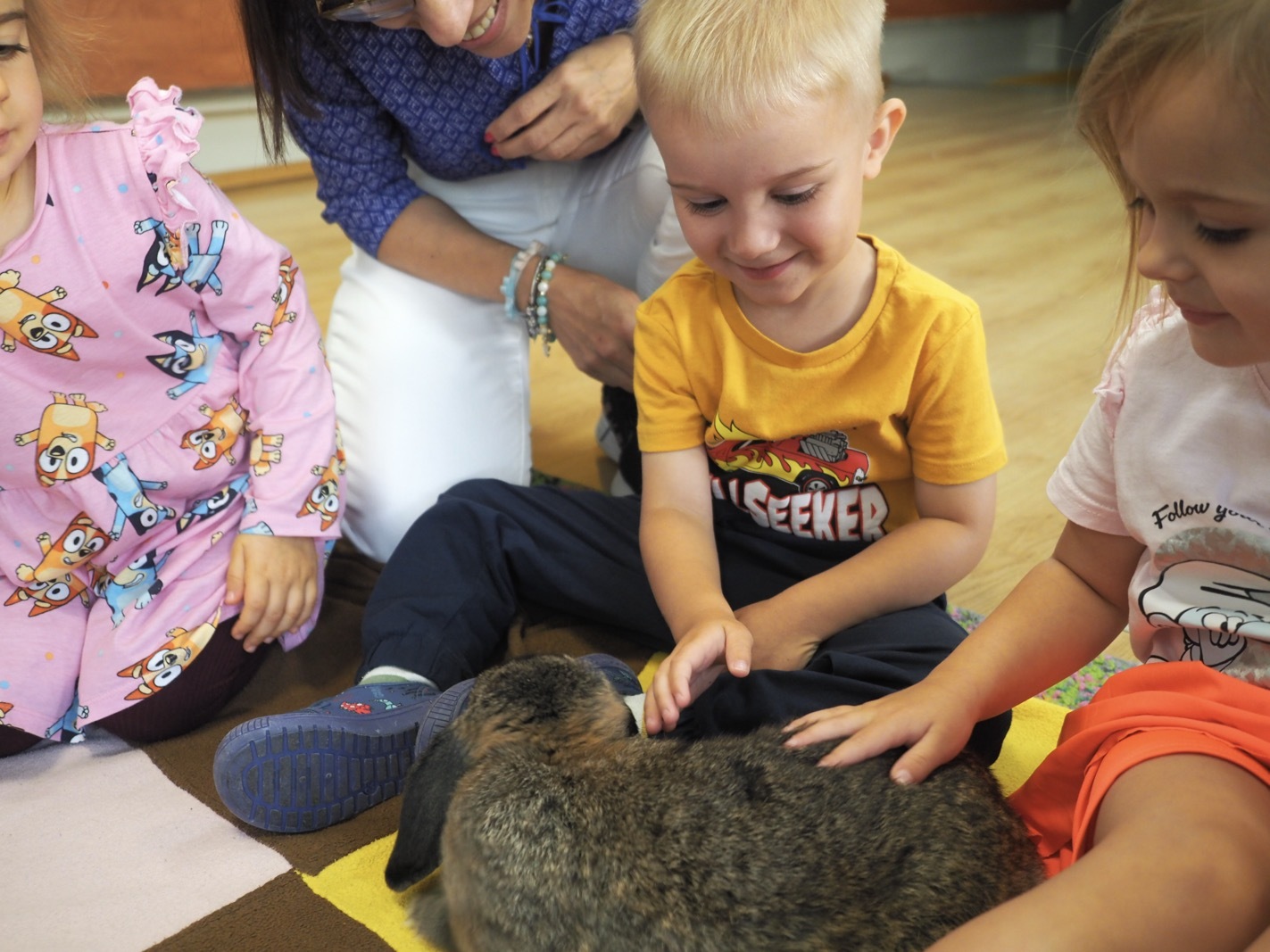 Dziś poznaliśmy cudownego króliczka - grupa 1. Każdy mógł pogłaskać zwierzątko i sprawdzić jakie ma długie i ciepłe uszka. Pierwsze w tym roku Warsztaty Przyrodnicze - Zwierzaki Cudaki. Kolejne już w październiku, wtedy poznamy inne zwierzątko.