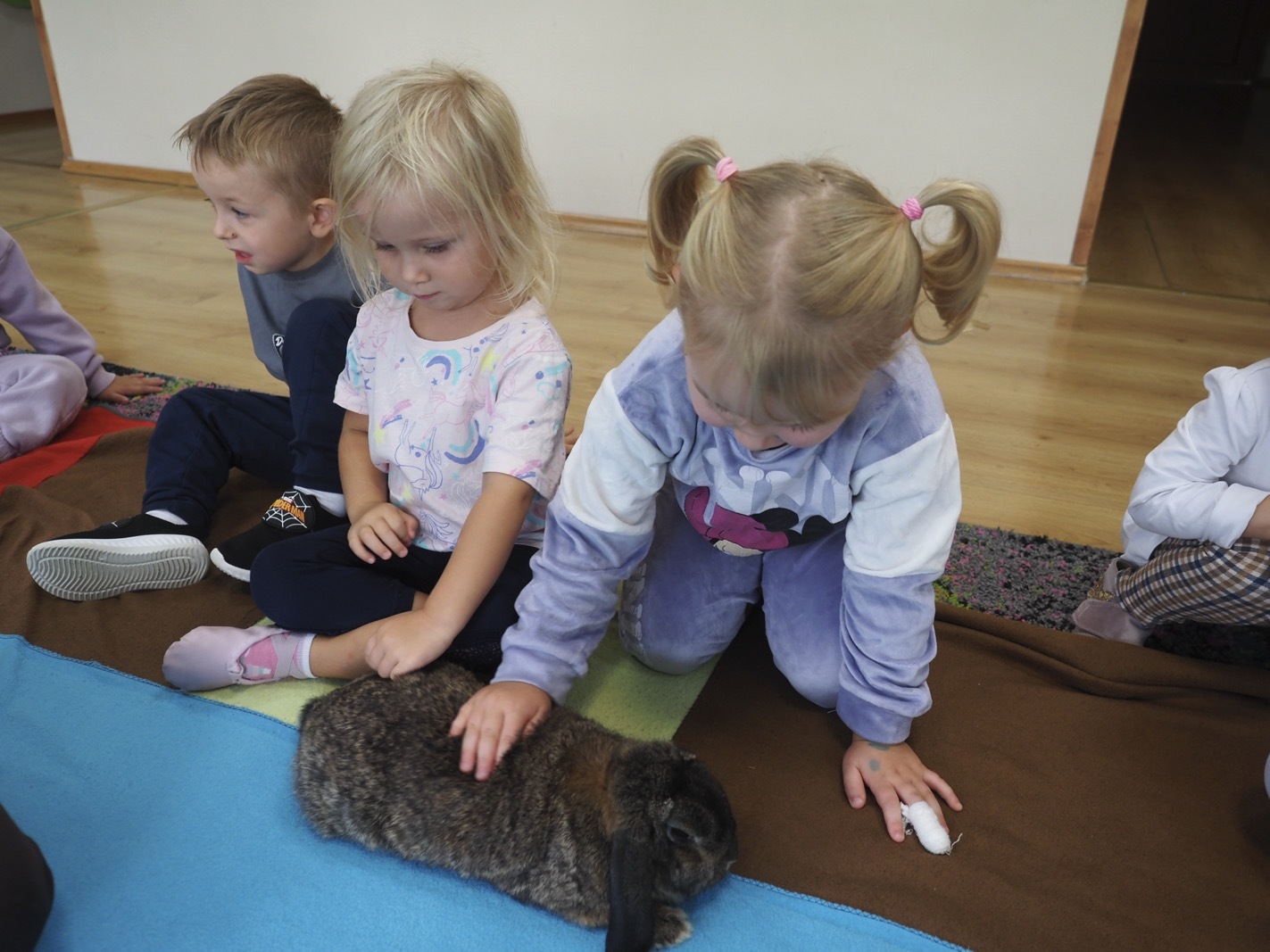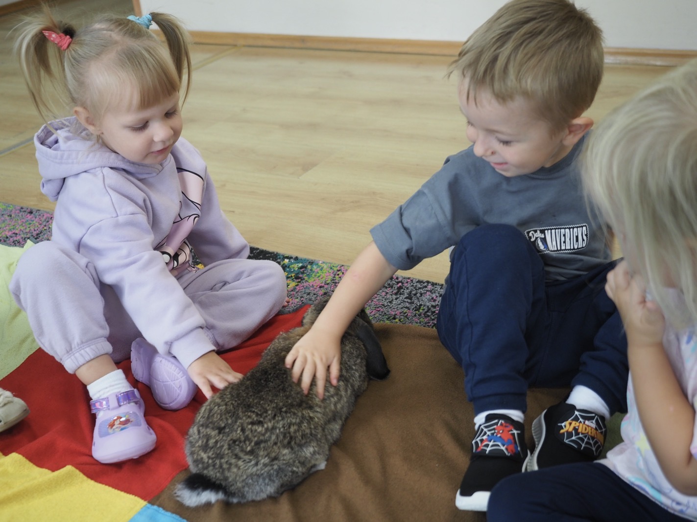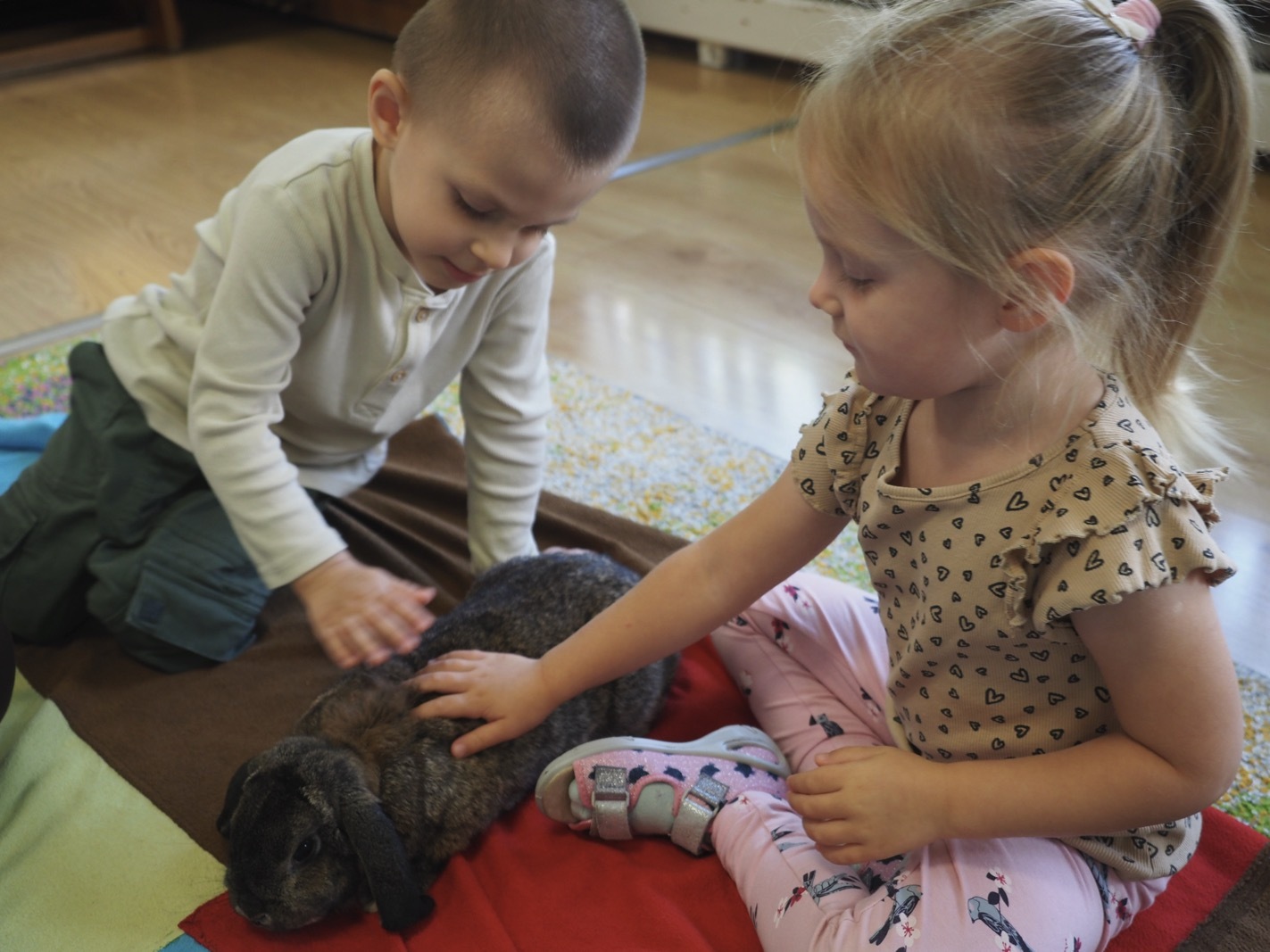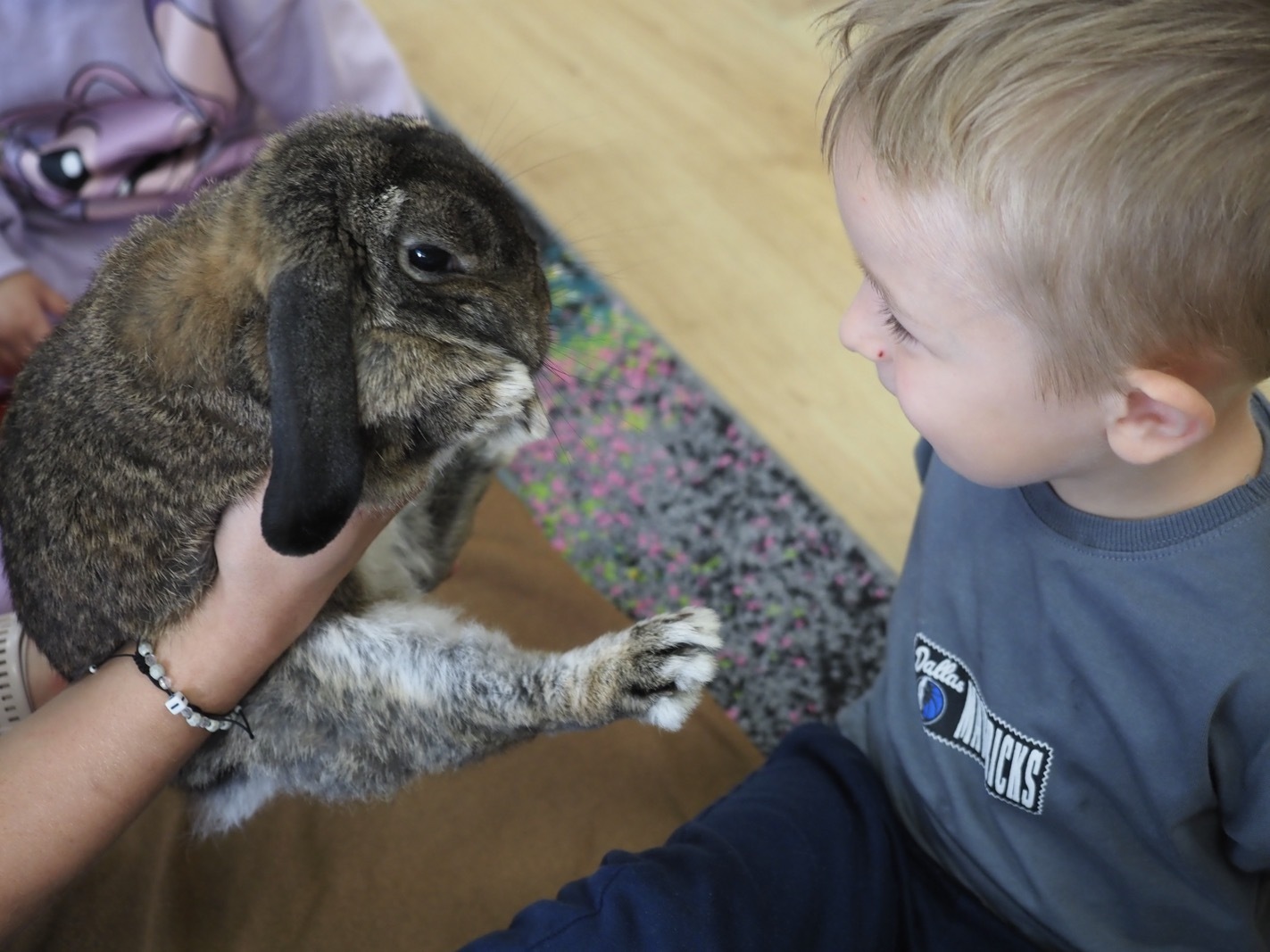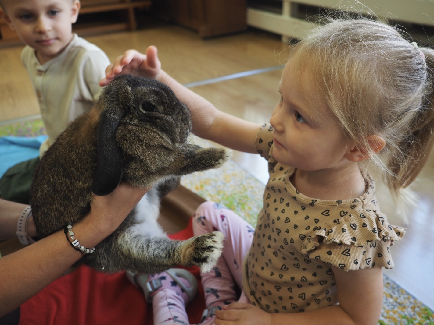 Dziś poznaliśmy cudownego króliczka - grupa 1. Każdy mógł pogłaskać zwierzątko i sprawdzić jakie ma długie i ciepłe uszka. Pierwsze w tym roku Warsztaty Przyrodnicze - Zwierzaki Cudaki. Kolejne już w październiku, wtedy poznamy inne zwierzątko.