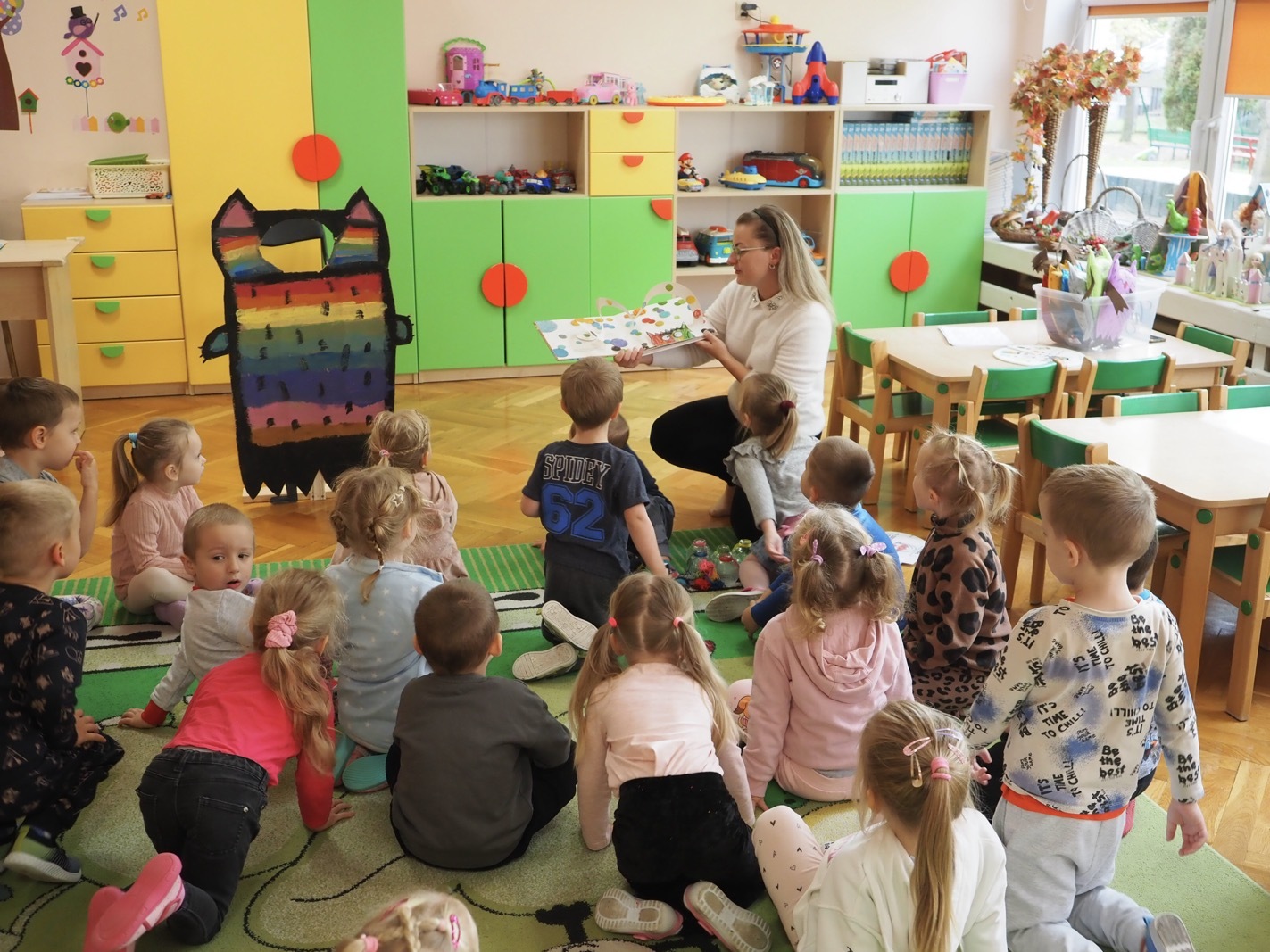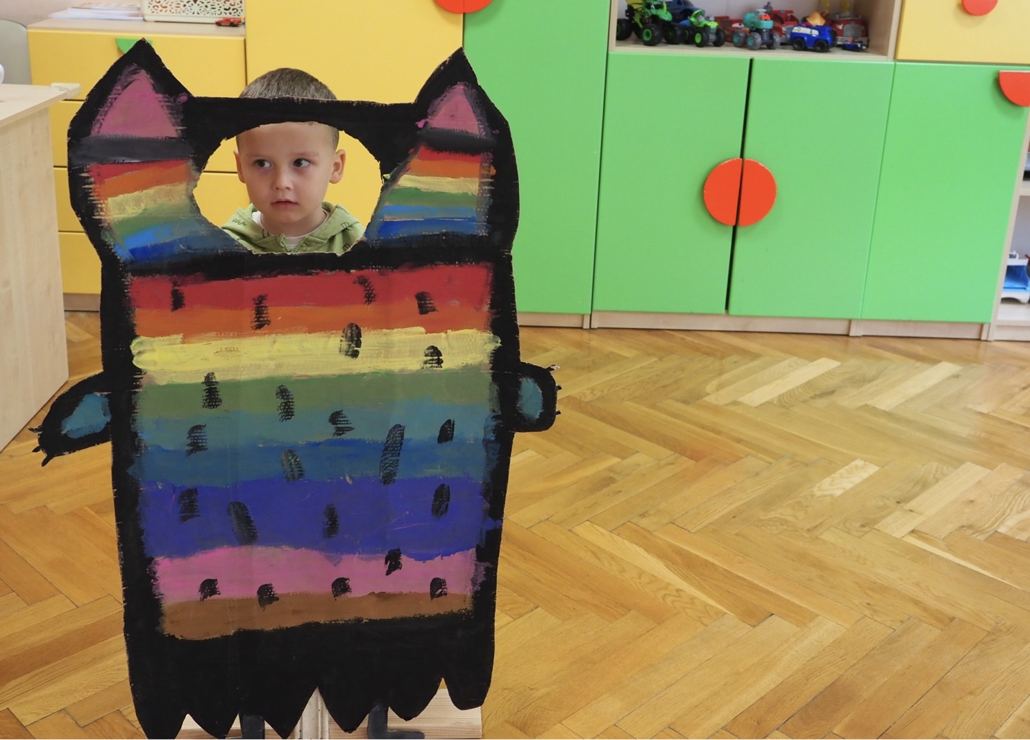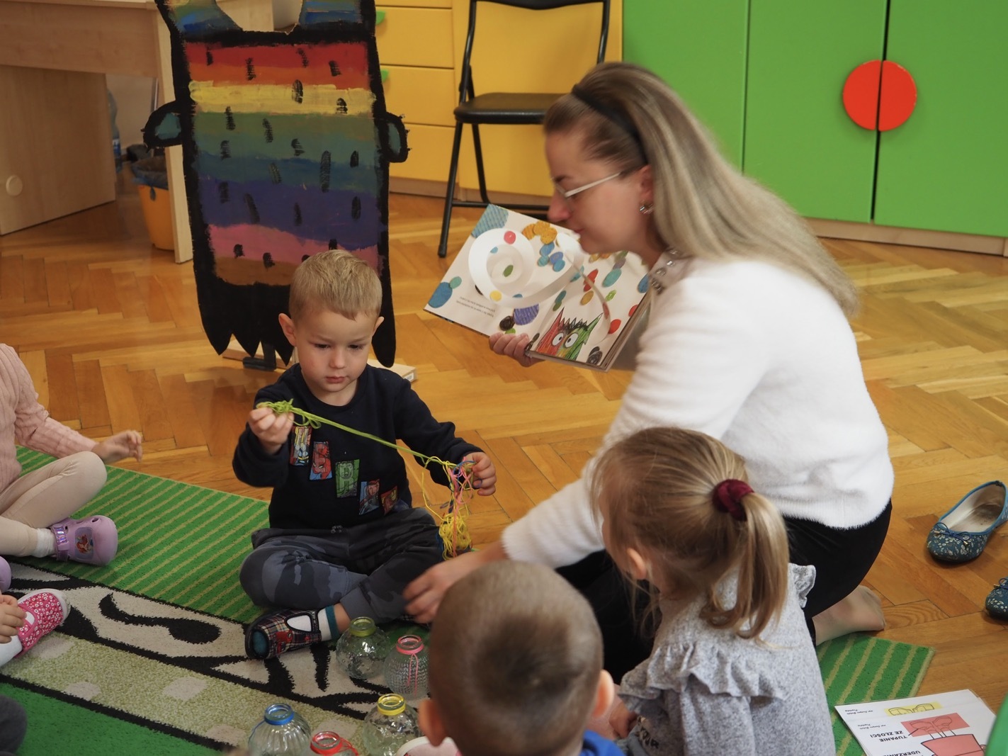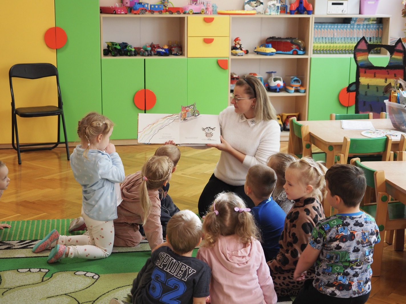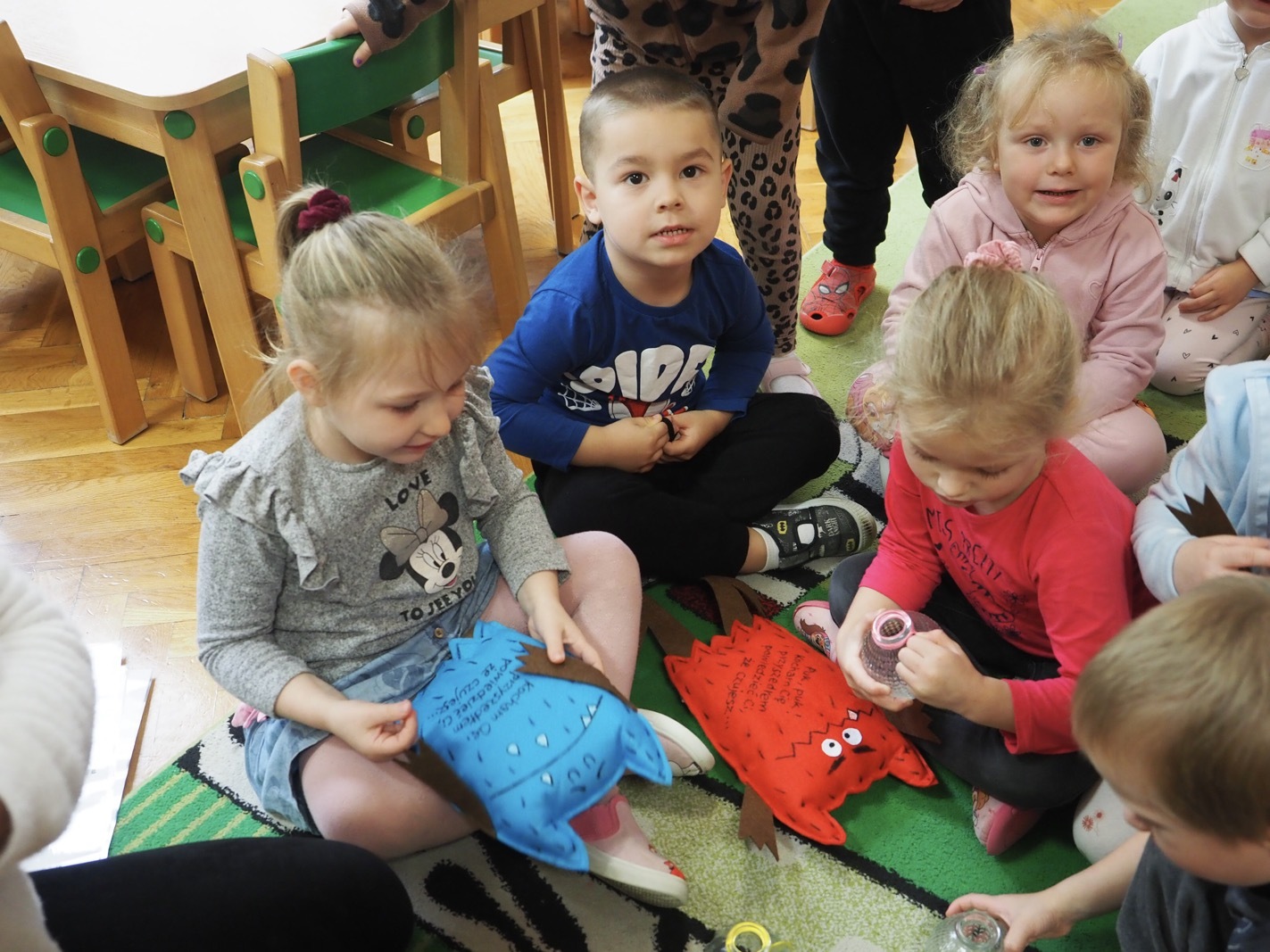 Zajęcia z Panią Sylwią - Panią psycholog. Dziś w grupie II odbyły się wyjątkowe zajęcia poświęcone poznawaniu i nazywaniu emocji. W ramach realizacji międzynarodowego projektu edukacyjnego dzieci miały okazję spotkać się z niezwykłym bohaterem – Kolorowym Potworem, który pomógł im uporządkować świat uczuć.