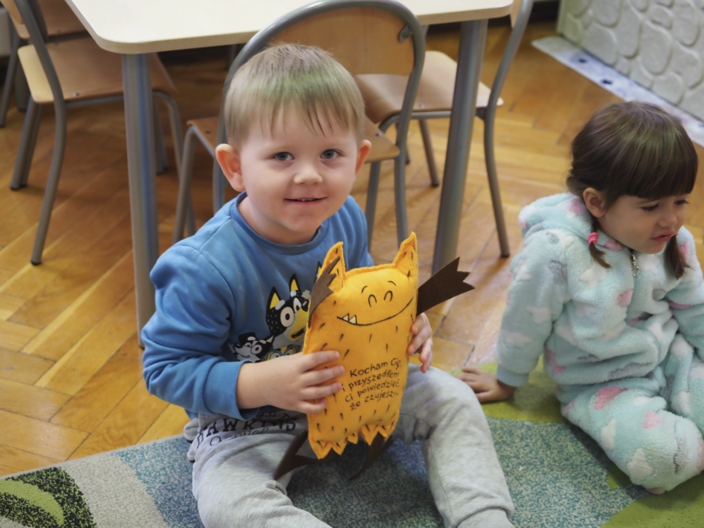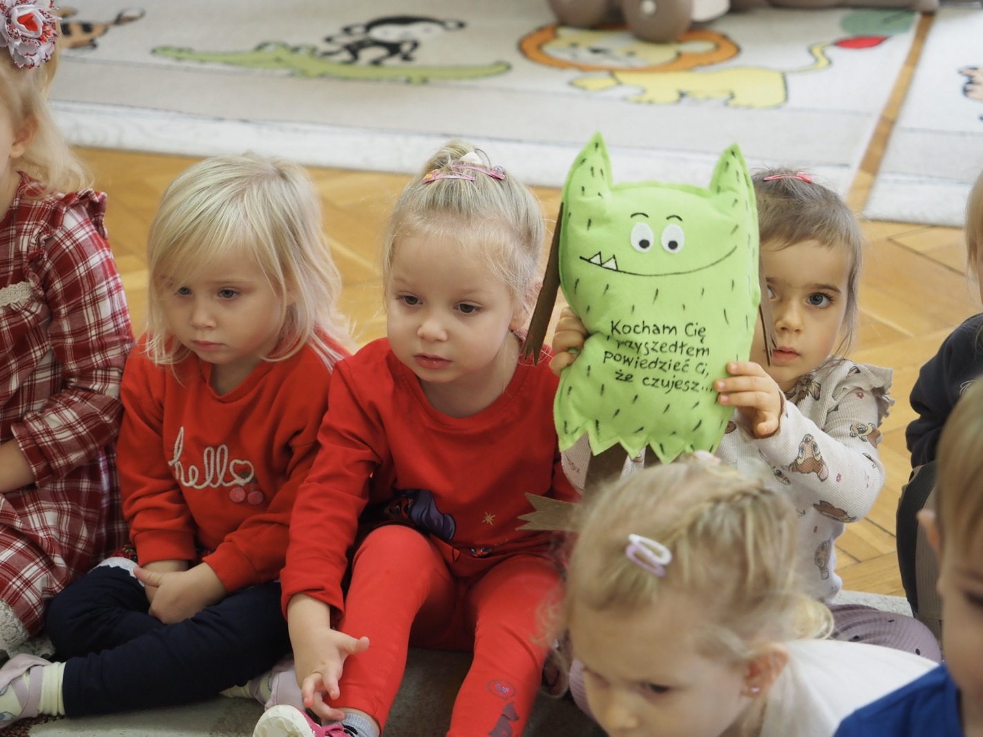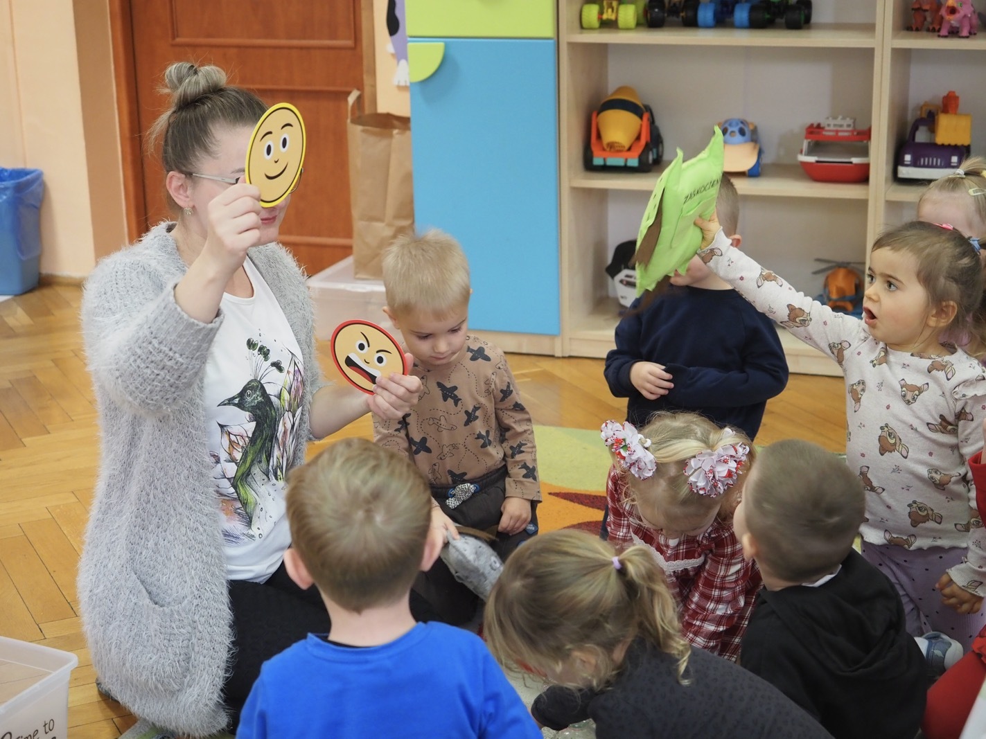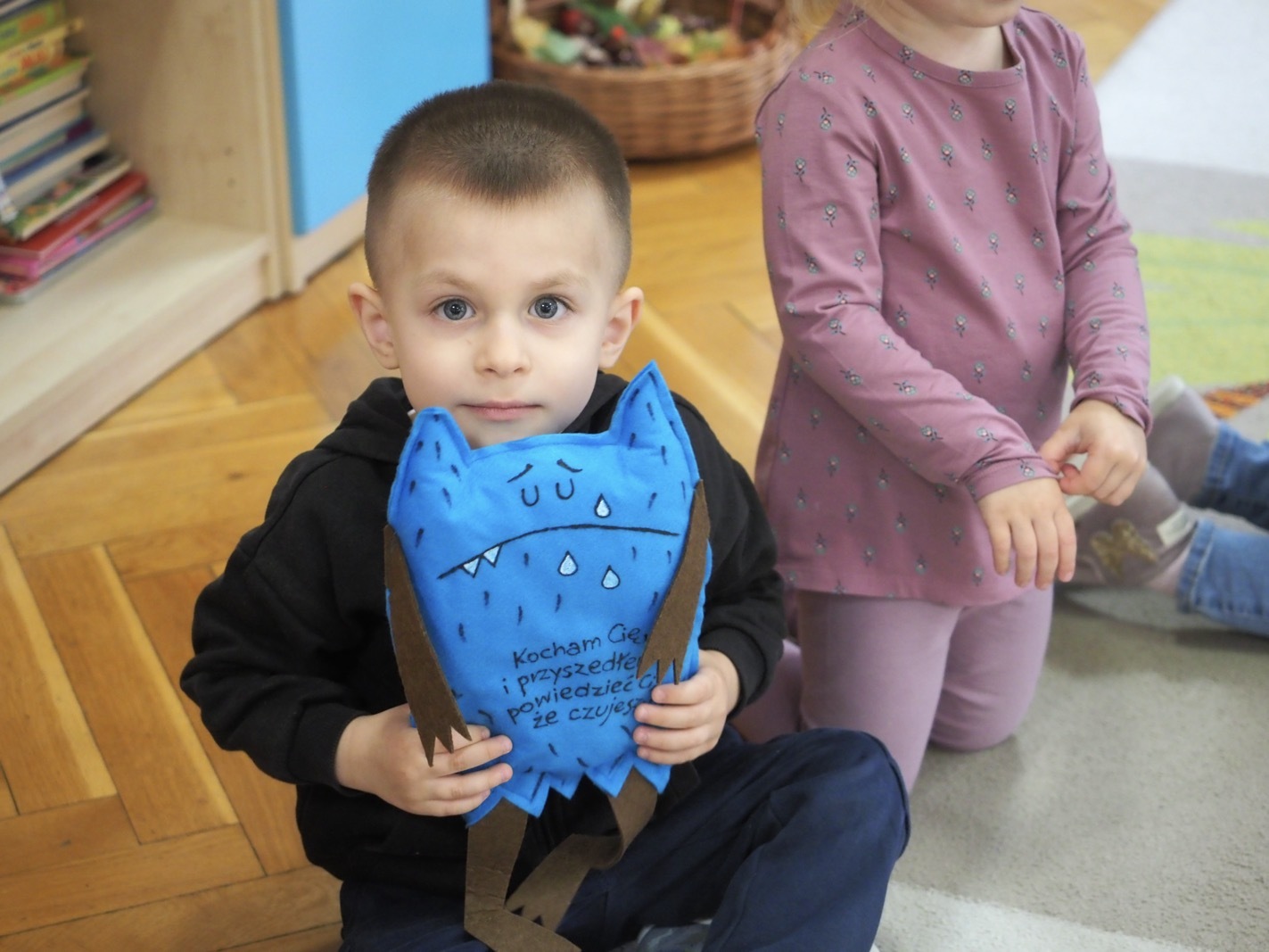 Zajęcia z Panią Sylwią - Panią psycholog. Dziś w grupie 1 odbyły się wyjątkowe zajęcia poświęcone poznawaniu i nazywaniu emocji. W ramach realizacji międzynarodowego projektu edukacyjnego dzieci miały okazję spotkać się z niezwykłym bohaterem – Kolorowym Potworem, który pomógł im uporządkować świat uczuć.