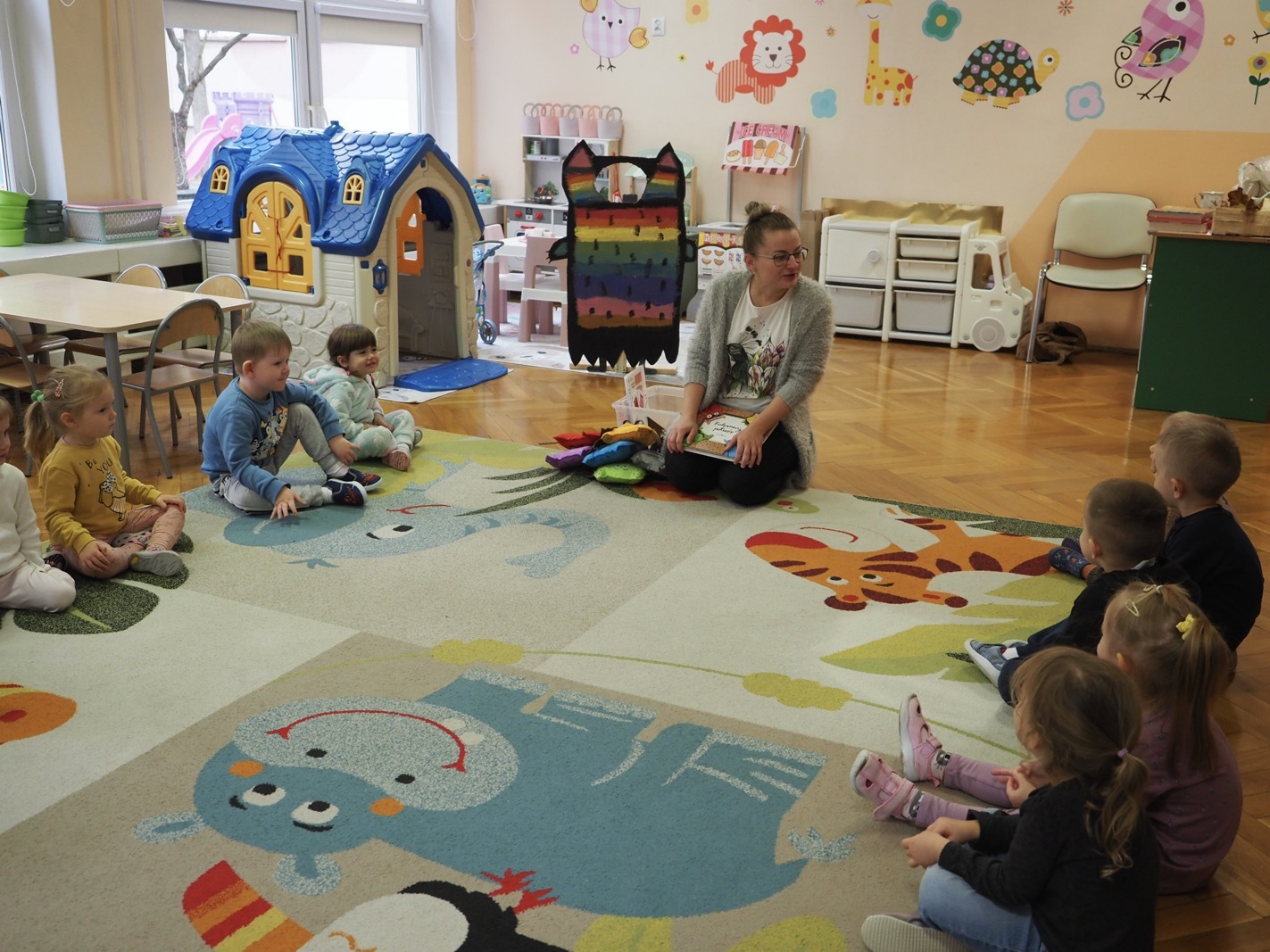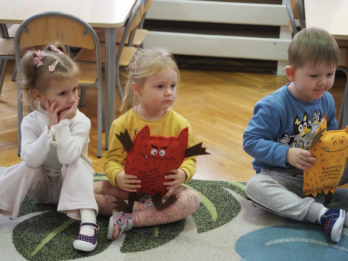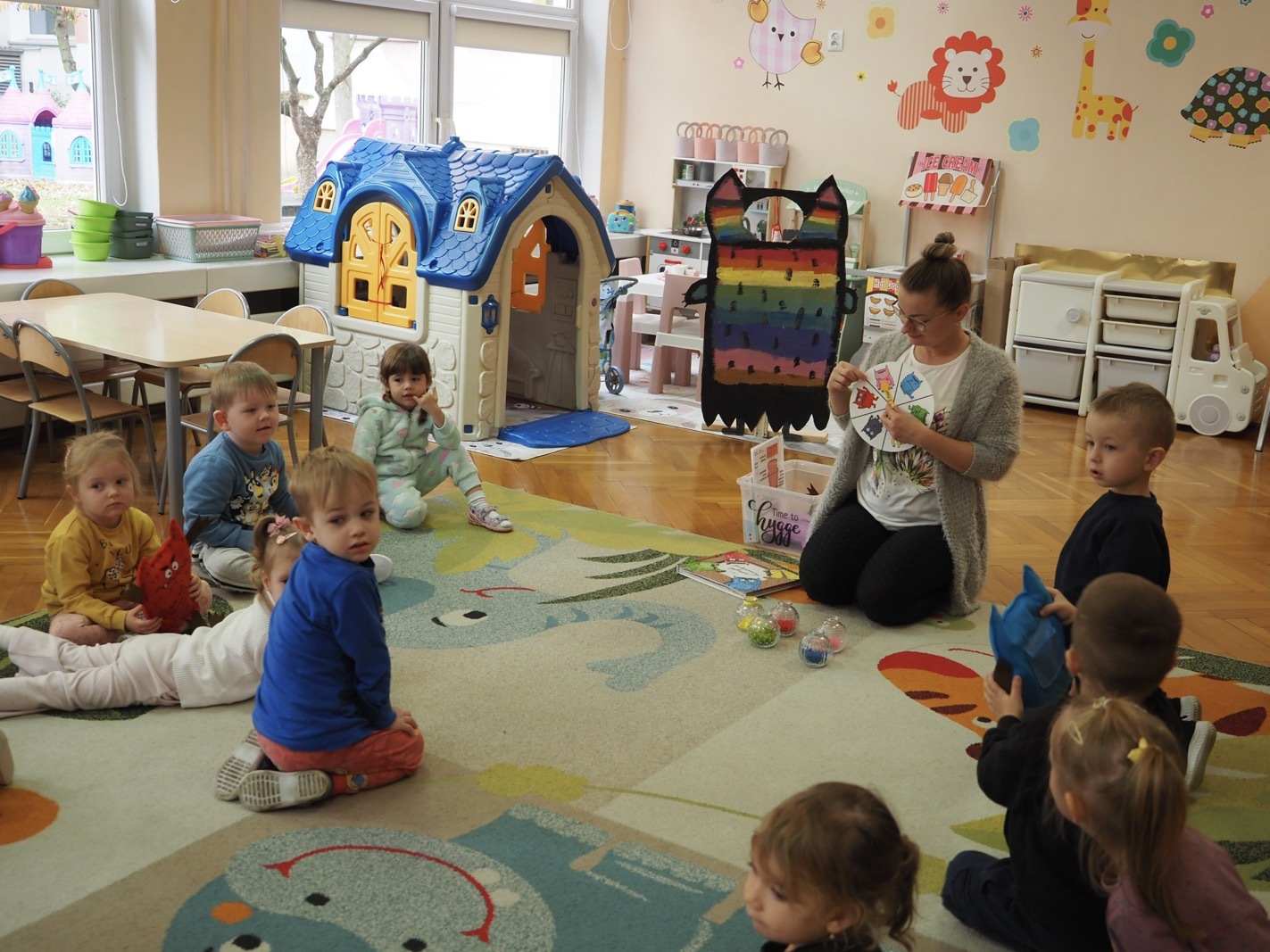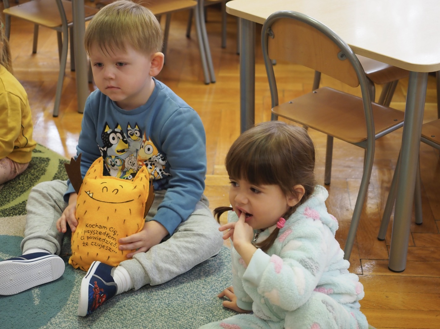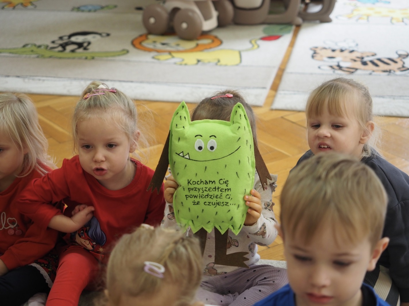 Zajęcia z Panią Sylwią - Panią psycholog. Dziś w grupie 1 odbyły się wyjątkowe zajęcia poświęcone poznawaniu i nazywaniu emocji. W ramach realizacji międzynarodowego projektu edukacyjnego dzieci miały okazję spotkać się z niezwykłym bohaterem – Kolorowym Potworem, który pomógł im uporządkować świat uczuć.